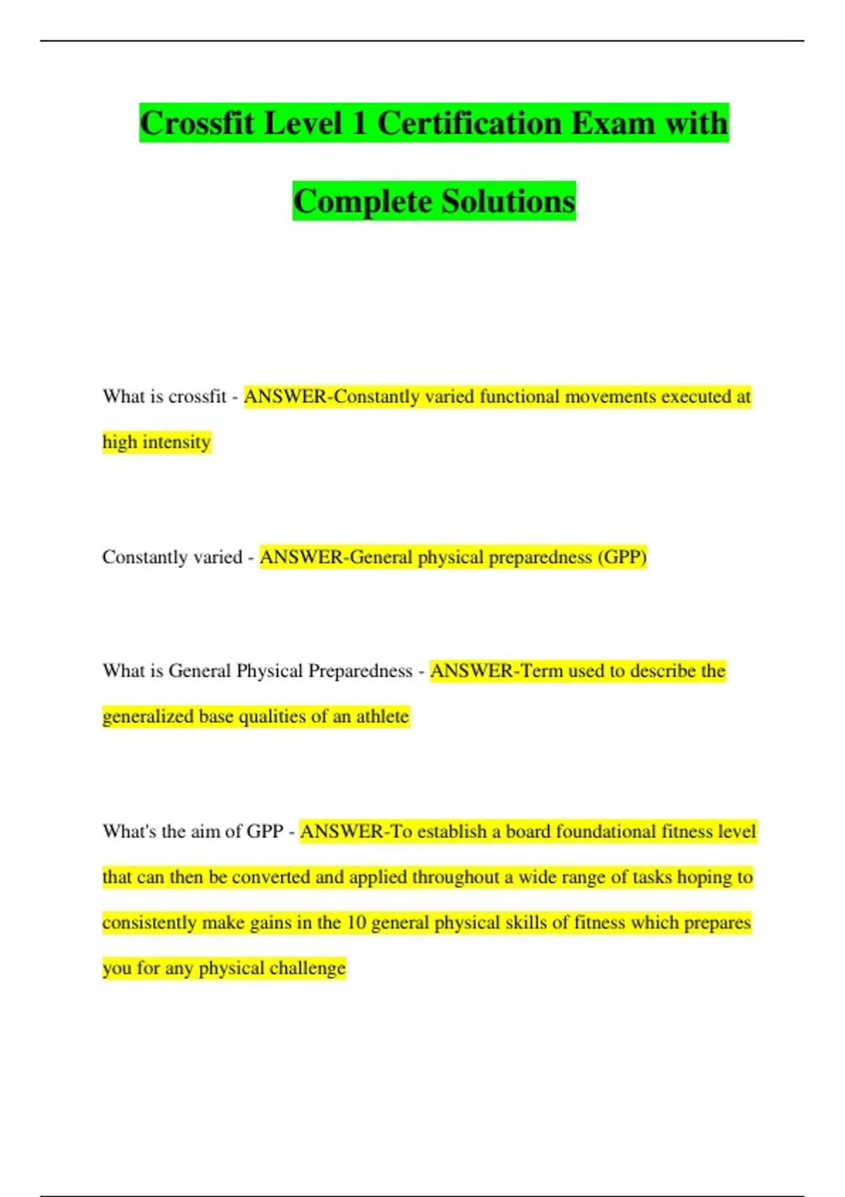 What is crossfit - ANSWER-Constantly varied functional movements executed at high intensity Constantly varied - ANSWER-General physical preparedness (GPP) What is General Physical Preparedness - ANSWER-Term used to describe the generalized base qualities of an athlete What's the aim of GPP - ANSWER-To establish a board foundational fitness level that can then be converted and applied throughout a wide range of tasks hoping to consistently make gains in the 10 general physical skills of fitness which prepares you for any physical challenge