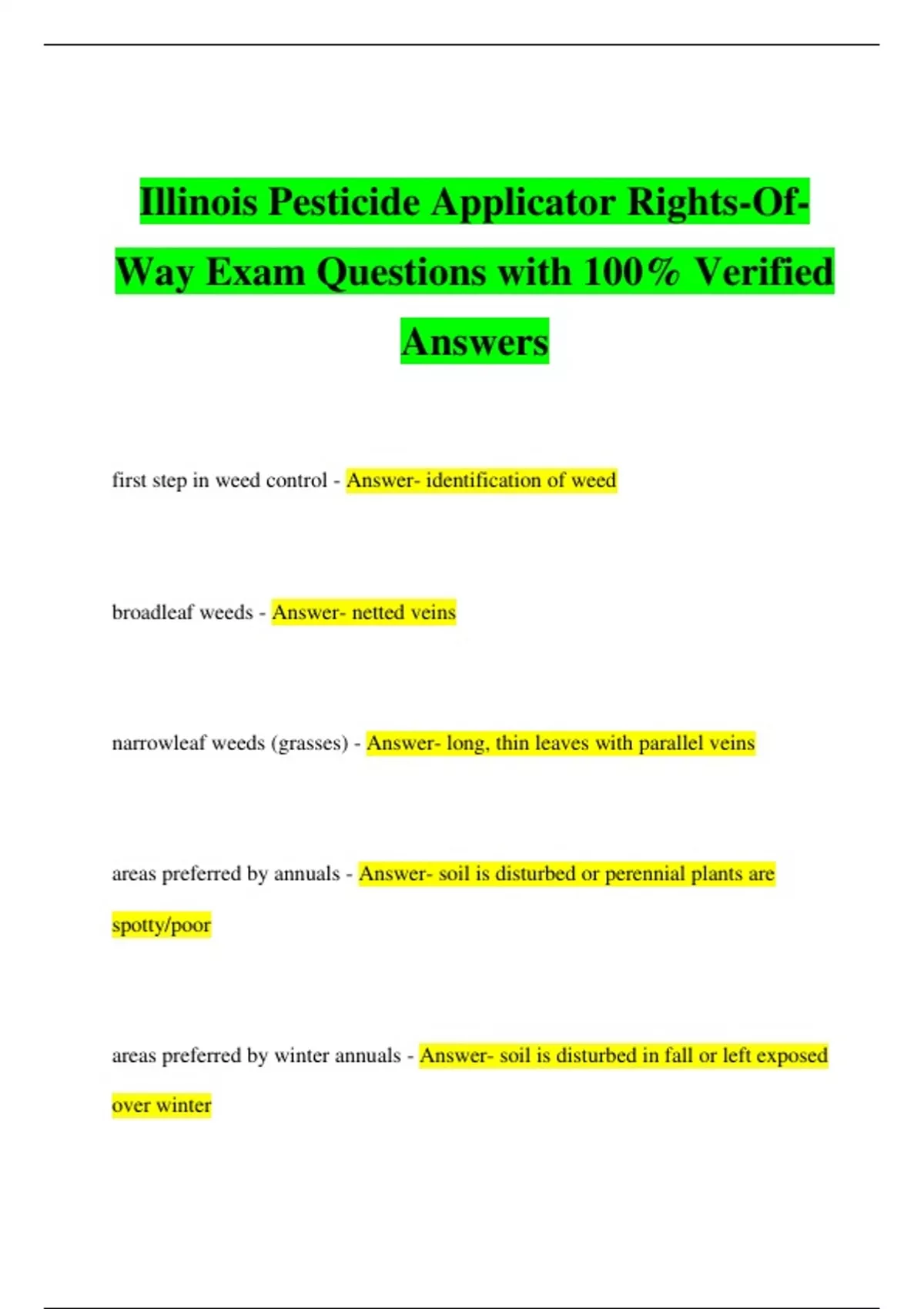 Illinois Pesticide Applicator Rights-Of- Way Exam Questions with 100% Verified Answers first step in weed control - Answer- identification of weed broadleaf weeds - Answer- netted veins narrowleaf weeds (grasses) - Answer- long, thin leaves with parallel veins areas preferred by annuals - Answer- soil is disturbed or perennial plants are spotty/poor areas preferred by winter annuals - Answer- soil is disturbed in fall or left exposed over winter