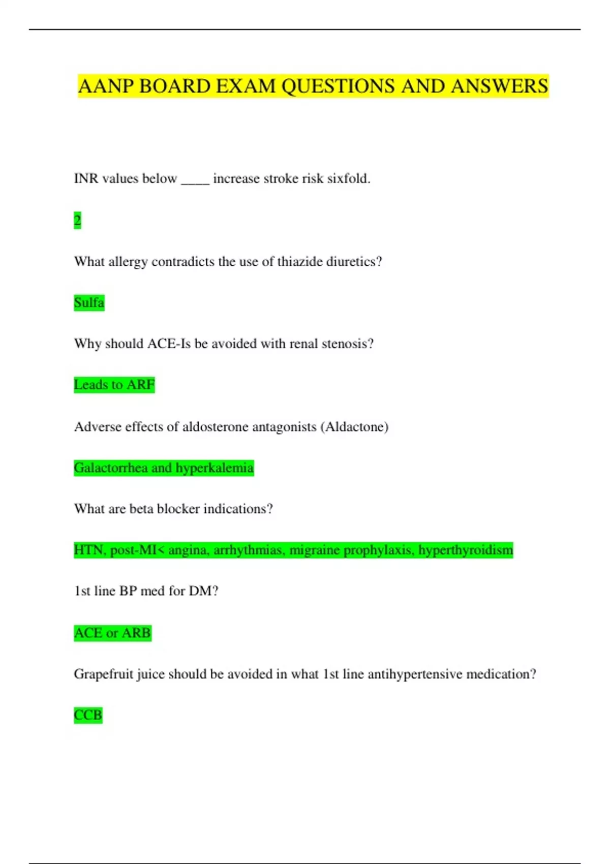 AANP BOARD EXAM QUESTIONS AND ANSWERS INR values below ____ increase stroke risk sixfold. 2 What allergy contradicts the use of thiazide diuretics? Sulfa Why should ACE-Is be avoided with renal stenosis? Leads to ARF Adverse effects of aldosterone antagonists (Aldactone) Galactorrhea and hyperkalemia What are beta blocker indications? HTN, post-MI< angina, arrhythmias, migraine prophylaxis, hyperthyroidism 1st line BP med for DM? ACE or ARB