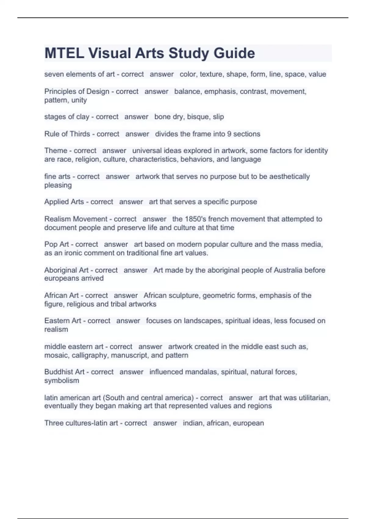 MTEL Visual Arts Study Guide Question and answers correctly solved 2023