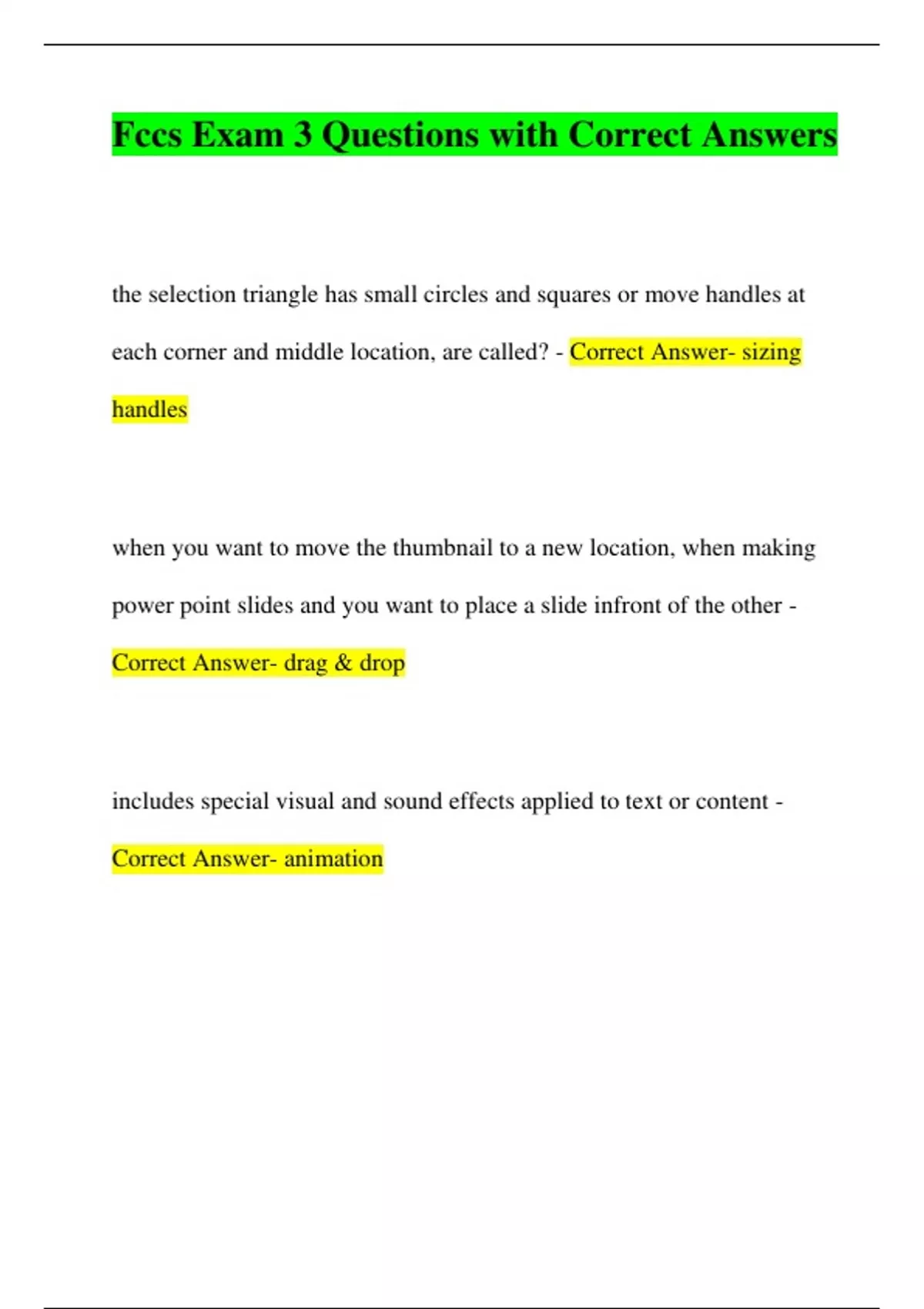 Fccs Exam 3 Questions with Correct Answers the selection triangle has small circles and squares or move handles at each corner and middle location, are called? - Correct Answer- sizing handles when you want to move the thumbnail to a new location, when making power point slides and you want to place a slide infront of the other - Correct Answer- drag & drop includes special visual and sound effects applied to text or content - Correct Answer- animation