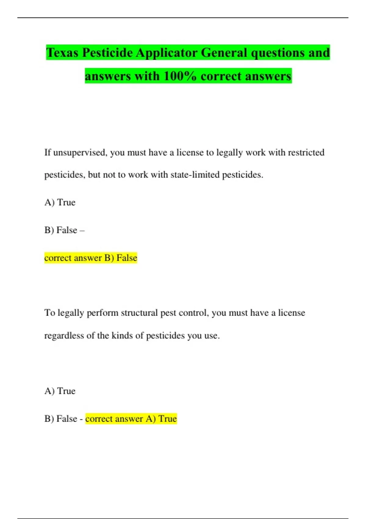 Texas Pesticide Applicator General questions and answers with 100% correct answers