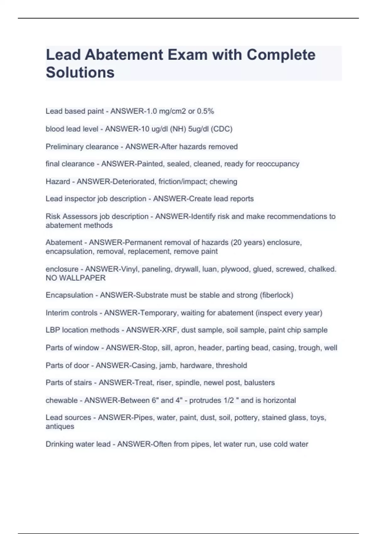 Lead based paint - ANSWER-1.0 mg/cm2 or 0.5% blood lead level - ANSWER-10 ug/dl (NH) 5ug/dl (CDC) Preliminary clearance - ANSWER-After hazards removed final clearance - ANSWER-Painted, sealed, cleaned, ready for reoccupancy Hazard - ANSWER-Deteriorated, friction/impact; chewing Lead inspector job description - ANSWER-Create lead reports Risk Assessors job description - ANSWER-Identify risk and make recommendations to abatement methods Abatement - ANSWER-Permanent removal of hazards (20 years) enclosure, encapsulation, removal, replacement, remove paint enclosure - ANSWER-Vinyl, paneling, drywall, luan, plywood, glued, screwed, chalked. NO WALLPAPER Encapsulation - ANSWER-Substrate must be stable and strong (fiberlock) Interim controls - ANSWER-Temporary, waiting for abatement (inspect every year) LBP location methods - ANSWER-XRF, dust sample, soil sample, paint chip sample Parts of window - ANSWER-Stop, sill, apron, header, parting bead, casing, trough, well Parts of door - ANSWER-Casing, jamb, hardware, threshold