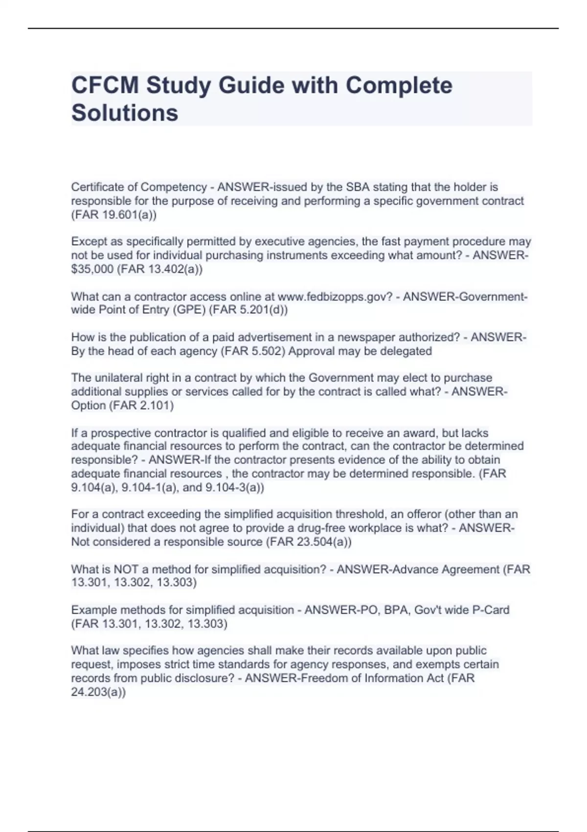 CFCM Study Guide with Complete SolutionsCFCM Study Guide with Complete SolutionsCFCM Study Guide with Complete SolutionsCFCM Study Guide with Complete Solutions Certificate of Competency - ANSWER-issued by the SBA stating that the holder is responsible for the purpose of receiving and performing a specific government contract (FAR 19.601(a)) Except as specifically permitted by executive agencies, the fast payment procedure may not be used for individual purchasing instruments exceeding what amount? - ANSWER-$35,000 (FAR 13.402(a)) What can a contractor access online at ? - ANSWER-Government-wide Point of Entry (GPE) (FAR 5.201(d)) How is the publication of a paid advertisement in a newspaper authorized? - ANSWER-By the head of each agency (FAR 5.502) Approval may be delegated The unilateral right in a contract by which the Government may elect to purchase additional supplies or services called for by the contract is called what? - ANSWER-