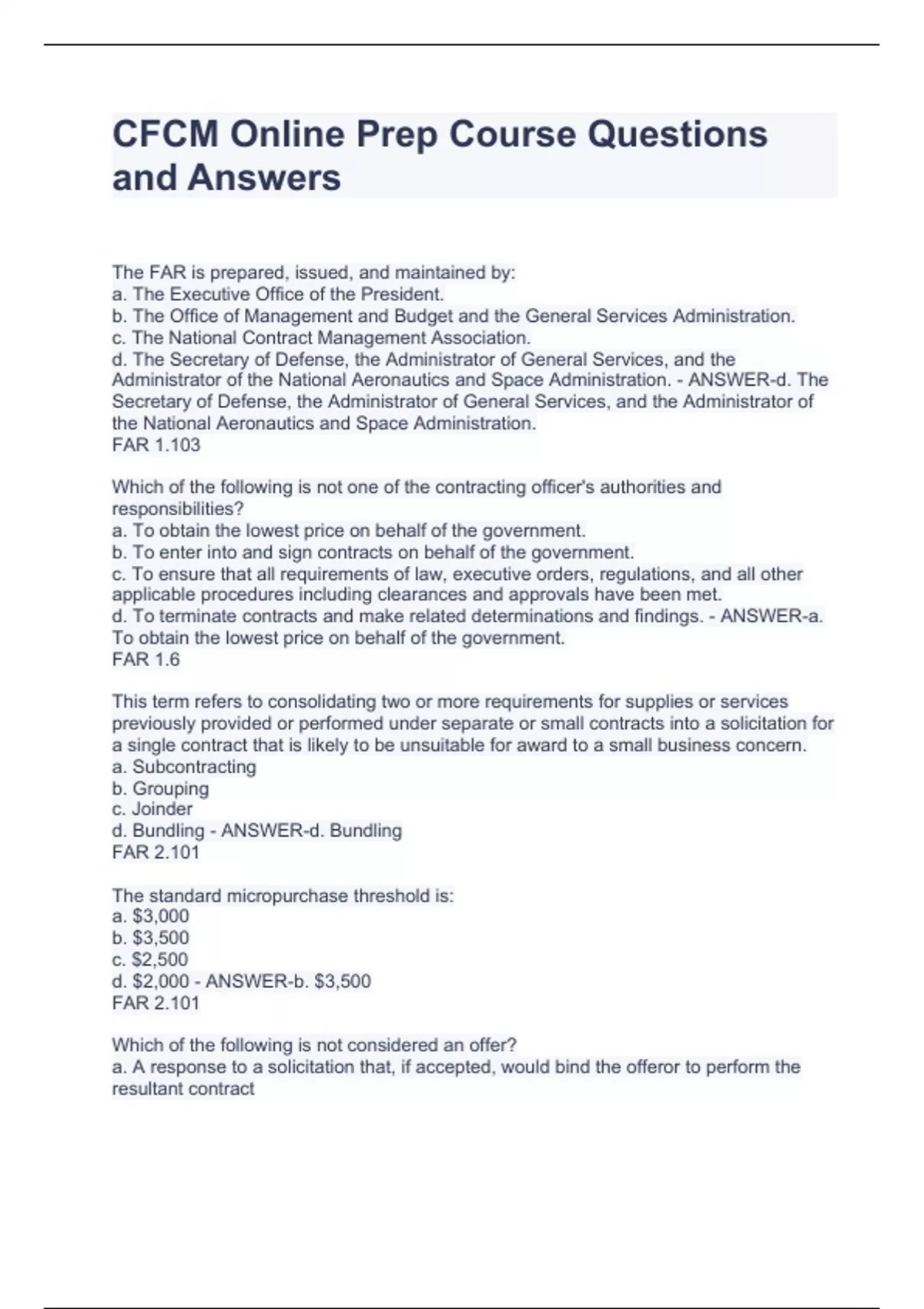 CFCM Online Prep Course Questions and AnswersCFCM Online Prep Course Questions and AnswersCFCM Online Prep Course Questions and Answers The FAR is prepared, issued, and maintained by: a. The Executive Office of the President. b. The Office of Management and Budget and the General Services Administration. c. The National Contract Management Association. d. The Secretary of Defense, the Administrator of General Services, and the Administrator of the National Aeronautics and Space Administration. - ANSWER-d. The Secretary of Defense, the Administrator of General Services, and the Administrator of the National Aeronautics and Space Administration. FAR 1.103 Which of the following is not one of the contracting officer's authorities and responsibilities? a. To obtain the lowest price on behalf of the government. b. To enter into and sign contracts on behalf of the government. c. To ensure that all requirements of law, executive orders, regulations, and all other applicable procedures including clearances and approvals have been met. d. To terminate contracts and make related determinations and findings. - ANSWER-a. To obtain the lowest price on behalf of the government. FAR 1.6 This term refers to consolidating two or more requirements for supplies or services previously provided or performed under separate or small contracts into a solicitation for a single contract that is likely to be unsuitable for award to a small business concern. a. Subcontracting b. Grouping c. Joinder d. Bundling - ANSWER-d. Bundling FAR 2.101 The standard micropurchase threshold is: a. $3,000 b. $3,500 c. $2,500 d. $2,000 - ANSWER-b. $3,500 FAR 2.101 Which of the following is not considered an offer? a. A response to a solicitation that, if accepted, would bind the offeror to perform the resultant contract