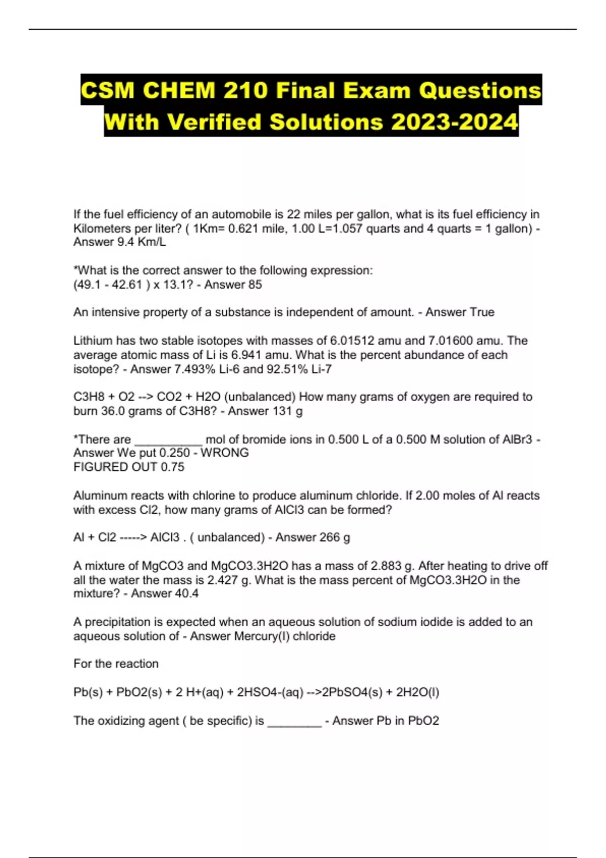 CSM CHEM 210 Final Exam Questions With Verified Solutions ...