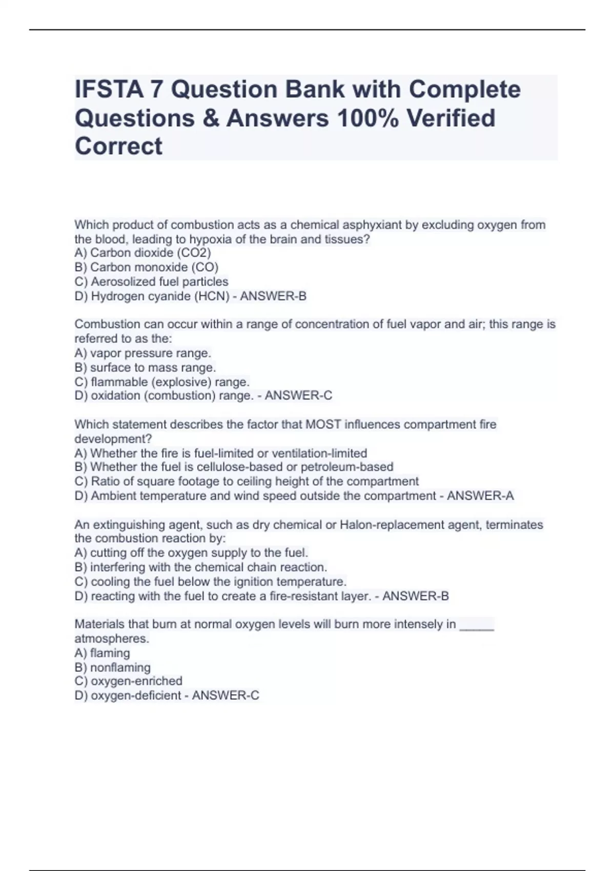 IFSTA 7 Question Bank with Complete Questions & Answers 100% Verified Correct IFSTA 7 Question Bank with Complete Questions & Answers 100% Verified Correct IFSTA 7 Question Bank with Complete Questions & Answers 100% Verified Correct IFSTA 7 Question Bank with Complete Questions & Answers 100% Verified Correct Which product of combustion acts as a chemical asphyxiant by excluding oxygen from the blood, leading to hypoxia of the brain and tissues? A) Carbon dioxide (CO2) B) Carbon monoxide (CO) C) Aerosolized fuel particles D) Hydrogen cyanide (HCN) - ANSWER-B Combustion can occur within a range of concentration of fuel vapor and air; this range is referred to as the: A) vapor pressure range. B) surface to mass range. C) flammable (explosive) range. D) oxidation (combustion) range. - ANSWER-C Which statement describes the factor that MOST influences compartment fire development? A) Whether the fire is fuel-limited or ventilation-limited B) Whether the fuel is cellulose-based or petroleum-based C) Ratio of square footage to ceiling height of the compartment D) Ambient temperature and wind speed outside the compartment - ANSWER-A An extinguishing agent, such as dry chemical or Halon-replacement agent, terminates the combustion reaction by: A) cutting off the oxygen supply to the fuel. B) interfering with the chemical chain reaction. C) cooling the fuel below the ignition temperature. D) reacting with the fuel to create a fire-resistant layer. - ANSWER-B Materials that burn at normal oxygen levels will burn more intensely in _____ atmospheres. A) flaming