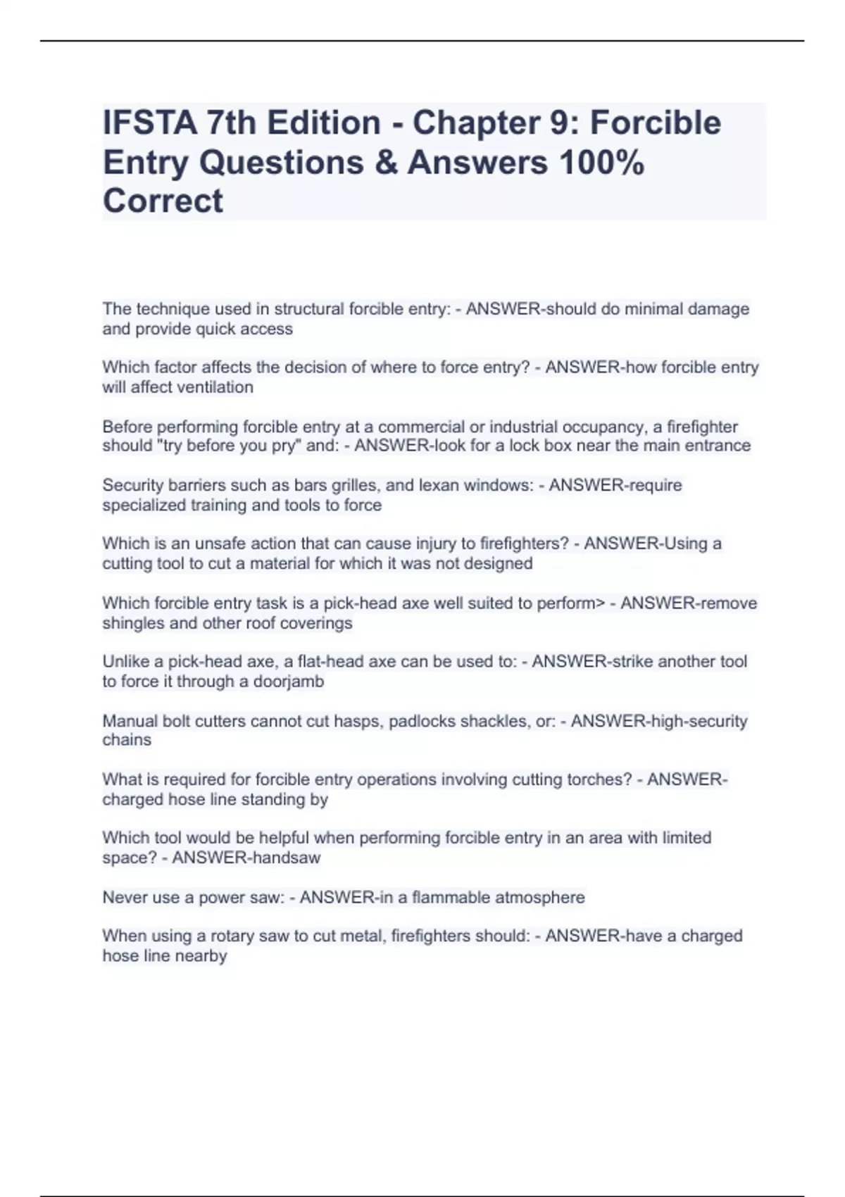 IFSTA 7th Edition - Chapter 9: Forcible Entry Questions & Answers 100% CorrectIFSTA 7th Edition - Chapter 9: Forcible Entry Questions & Answers 100% CorrectIFSTA 7th Edition - Chapter 9: Forcible Entry Questions & Answers 100% CorrectIFSTA 7th Edition - Chapter 9: Forcible Entry Questions & Answers 100% CorrectThe technique used in structural forcible entry: - ANSWER-should do minimal damage and provide quick access Which factor affects the decision of where to force entry? - ANSWER-how forcible entry will affect ventilation Before performing forcible entry at a commercial or industrial occupancy, a firefighter should "try before you pry" and: - ANSWER-look for a lock box near the main entrance Security barriers such as bars grilles, and lexan windows: - ANSWER-require specialized training and tools to force