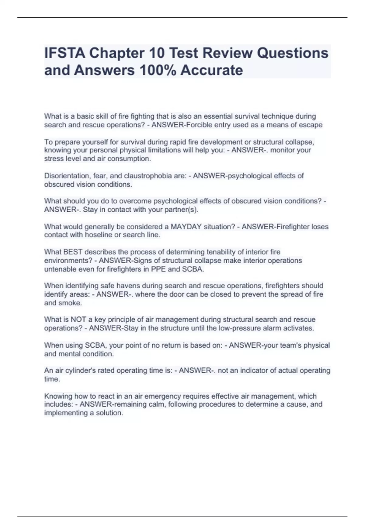 IFSTA Chapter 10 Test Review Questions and Answers 100% Accurate IFSTA Chapter 10 Test Review Questions and Answers 100% Accurate IFSTA Chapter 10 Test Review Questions and Answers 100% Accurate IFSTA Chapter 10 Test Review Questions and Answers 100% Accurate What is a basic skill of fire fighting that is also an essential survival technique during search and rescue operations? - ANSWER-Forcible entry used as a means of escape To prepare yourself for survival during rapid fire development or structural collapse, knowing your personal physical limitations will help you: - ANSWER-. monitor your stress level and air consumption. Disorientation, fear, and claustrophobia are: - ANSWER-psychological effects of obscured vision conditions. What should you do to overcome psychological effects of obscured vision conditions? -