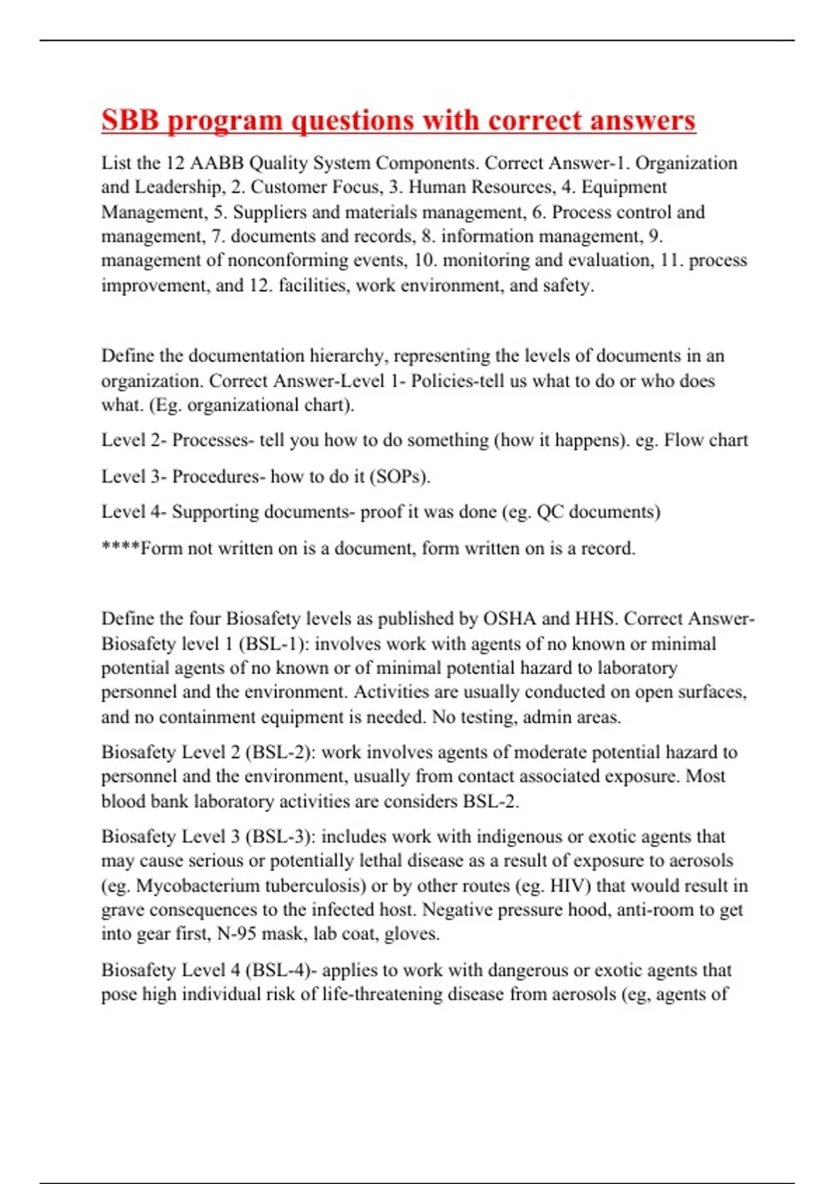 List the 12 AABB Quality System Components. Correct Answer-1. Organization and Leadership, 2. Customer Focus, 3. Human Resources, 4. Equipment Management, 5. Suppliers and materials management, 6. Process control and management, 7. documents and records, 8. information management, 9. management of nonconforming events, 10. monitoring and evaluation, 11. process improvement, and 12. facilities, work environment, and safety. Define the documentation hierarchy, representing the levels of documents in an organization. Correct Answer-Level 1- Policies-tell us what to do or who does what. (Eg. organizational chart). Level 2- Processes- tell you how to do something (how it happens). eg. Flow chart Level 3- Procedures- how to do it (SOPs). Level 4- Supporting documents- proof it was done (eg. QC documents) ****Form not written on is a document, form written on is a record. Define the four Biosafety levels as published by OSHA and HHS. Correct Answer-Biosafety level 1 (BSL-1): involves work with agents of no known or minimal potential agents of no known or of minimal potential hazard to laboratory personnel and the environment. Activities are usually conducted on open surfaces, and no containment equipment is needed. No testing, admin areas. Biosafety Level 2 (BSL-2): work involves agents of moderate potential hazard to personnel and the environment, usually from contact associated exposure. Most blood bank laboratory activities are considers BSL-2. Biosafety Level 3 (BSL-3): includes work with indigenous or exotic agents that may cause serious or potentially lethal disease as a result of exposure to aerosols (eg. Mycobacterium tuberculosis) or by other routes (eg. HIV) that would result in grave consequences to the infected host. Negative pressure hood, anti-room to get into gear first, N-95 mask, lab coat, gloves. Biosafety Level 4 (BSL-4)- applies to work with dangerous or exotic agents that pose high individual risk of life-threatening dis