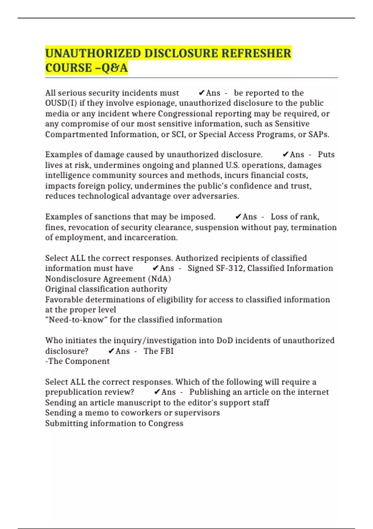 UNAUTHORIZED DISCLOSURE REFRESHER COURSE –Q&A