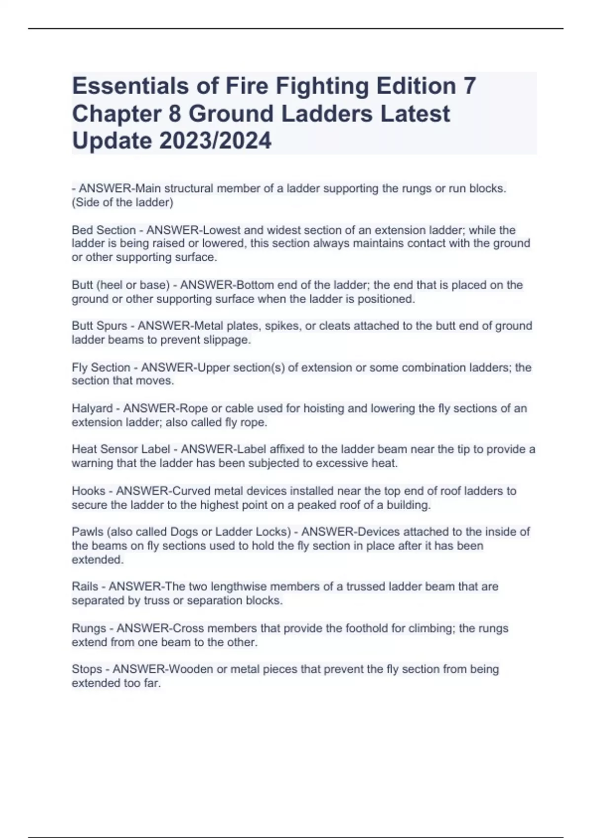 Essentials of Fire Fighting Edition 7 Chapter 8 Ground Ladders Latest Update 2023/2024Essentials of Fire Fighting Edition 7 Chapter 8 Ground Ladders Latest Update 2023/2024Essentials of Fire Fighting Edition 7 Chapter 8 Ground Ladders Latest Update 2023/2024 - ANSWER-Main structural member of a ladder supporting the rungs or run blocks. (Side of the ladder) Bed Section - ANSWER-Lowest and widest section of an extension ladder; while the ladder is being raised or lowered, this section always maintains contact with the ground or other supporting surface. Butt (heel or base) - ANSWER-Bottom end of the ladder; the end that is placed on the ground or other supporting surface when the ladder is positioned. Butt Spurs - ANSWER-Metal plates, spikes, or cleats attached to the butt end of ground