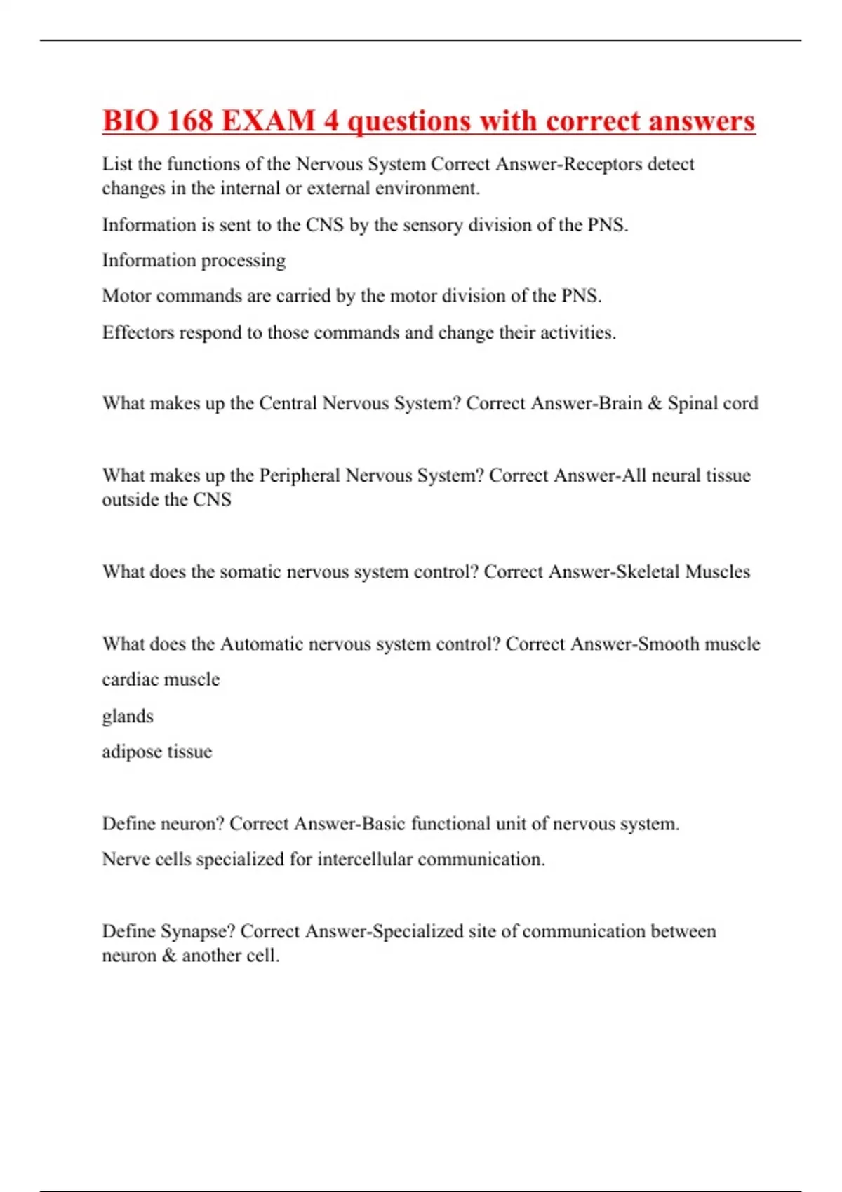 List the functions of the Nervous System Correct Answer-Receptors detect changes in the internal or external environment. Information is sent to the CNS by the sensory division of the PNS. Information processing Motor commands are carried by the motor division of the PNS. Effectors respond to those commands and change their activities. What makes up the Central Nervous System? Correct Answer-Brain & Spinal cord What makes up the Peripheral Nervous System? Correct Answer-All neural tissue outside the CNS What does the somatic nervous system control? Correct Answer-Skeletal Muscles What does the Automatic nervous system control? Correct Answer-Smooth muscle cardiac muscle glands adipose tissue Define neuron? Correct Answer-Basic functional unit of nervous system. Nerve cells specialized for intercellular commu