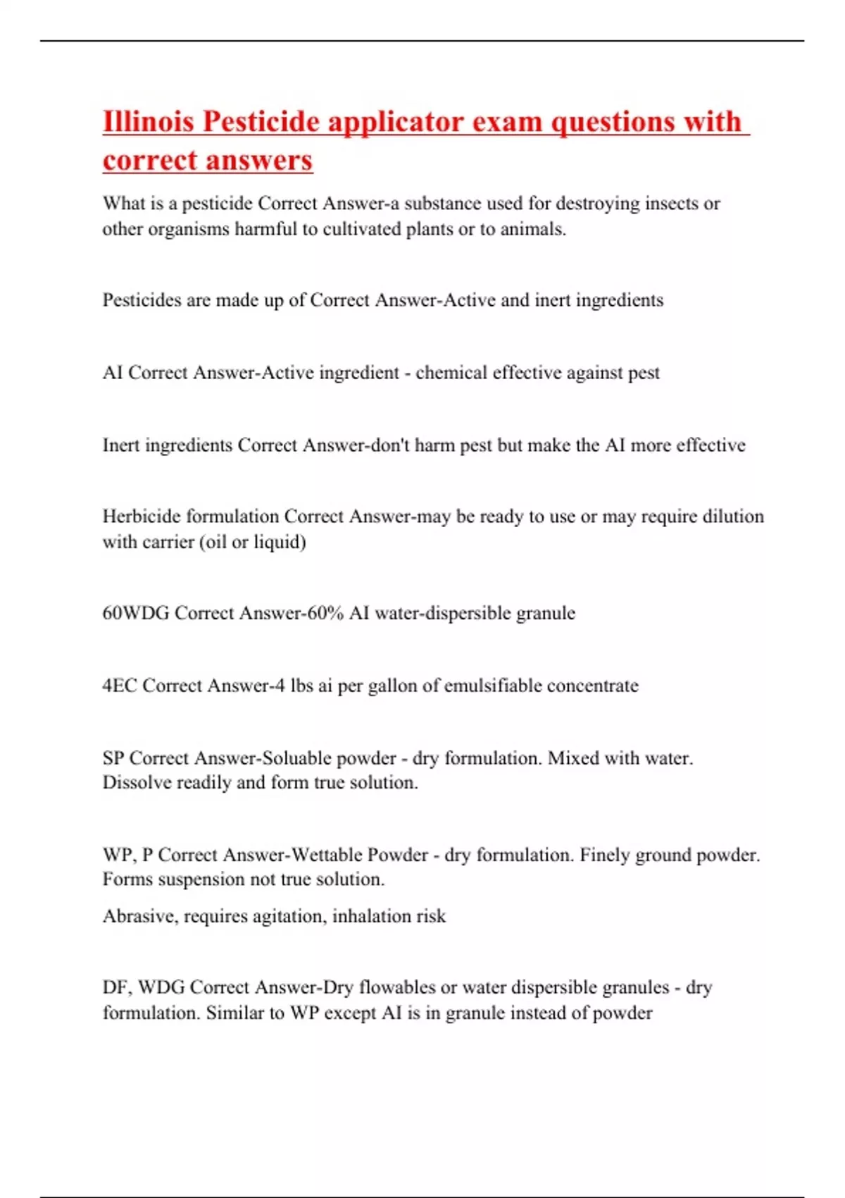 What is a pesticide Correct Answer-a substance used for destroying insects or other organisms harmful to cultivated plants or to animals. Pesticides are made up of Correct Answer-Active and inert ingredients AI Correct Answer-Active ingredient - chemical effective against pest Inert ingredients Correct Answer-don't harm pest but make the AI more effective Herbicide formulation Correct Answer-may be ready to use or may require dilution with carrier (oil or liquid) 60WDG Correct Answer-60% AI water-dispersible granule 4EC Correct Answer-4 lbs ai per gallon of emulsifiable concentrate SP Correct Answer-Soluable powder - dry formulation. Mixed with water. Dissolve readily and form true solution. WP, P Correct Answer-Wettable Powder - dry formulation. Finely ground powder. Forms suspension not true solution. Abrasive, requires agitation, inhalation risk DF, WDG Correct Answer-Dry flowables or wate