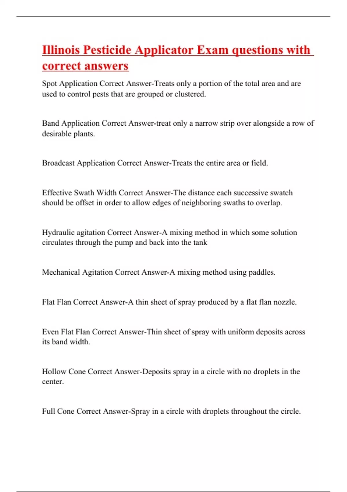 Spot Application Correct Answer-Treats only a portion of the total area and are used to control pests that are grouped or clustered. Band Application Correct Answer-treat only a narrow strip over alongside a row of desirable plants. Broadcast Application Correct Answer-Treats the entire area or field. Effective Swath Width Correct Answer-The distance each successive swatch should be offset in order to allow edges of neighboring swaths to overlap. Hydraulic agitation Correct Answer-A mixing method in which some solution circulates through the pump and back into the tank Mechanical Agitation Correct Answer-A mixing method using paddles. Flat Flan Correct Answer-A thin sheet of spray produced by a flat flan nozzle. Even Flat Flan Correct Answer-Thin sheet of spray with uniform deposits across its band width. Hollow Cone Correct Answer-Deposits spray in a circle with no droplets in the center. Full Cone Correct Answer-Spray in a circle with dr