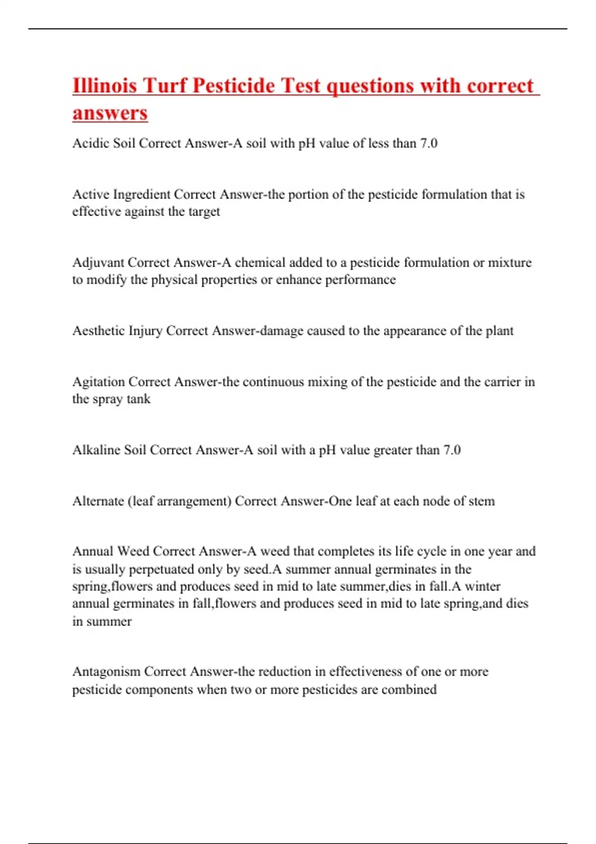 Acidic Soil Correct Answer-A soil with pH value of less than 7.0 Active Ingredient Correct Answer-the portion of the pesticide formulation that is effective against the target Adjuvant Correct Answer-A chemical added to a pesticide formulation or mixture to modify the physical properties or enhance performance Aesthetic Injury Correct Answer-damage caused to the appearance of the plant Agitation Correct Answer-the continuous mixing of the pesticide and the carrier in the spray tank Alkaline Soil Correct Answer-A soil with a pH value greater than 7.0 Alternate (leaf arrangement) Correct Answer-One leaf at each node of stem Annual Weed Correct Answer-A weed that completes its life cycle in one year and is usually perpetuated only by seed.A summer annual germinates in the spring,flowers and produces seed in mid to late summer,dies in fall.A winter annual germinates in fall,flowers and produces seed in mid to late spring,and dies in summer Antagonism Correct Answer-the reduction in effectiveness of one or more pesticide components when two or more pesticides are co