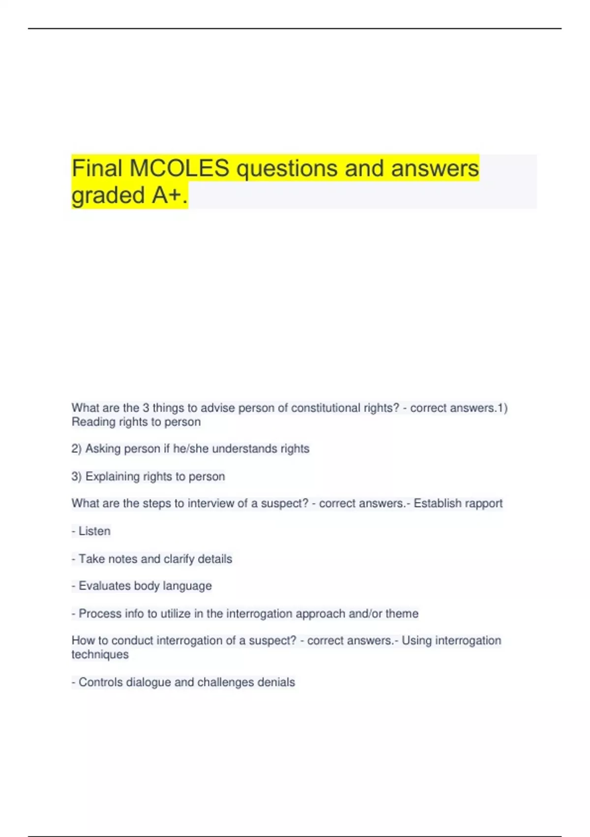 Final MCOLES questions and answers graded A+. What are the 3 things to advise person of constitutional rights? - correct answers.1) Reading rights to person 2) Asking person if he/she understands rights 3) Explaining rights to person What are the steps to interview of a suspect? - correct answers.- Establish rapport - Listen - Take notes and clarify details - Evaluates body language - Process info to utilize in the interrogation approach and/or theme How to conduct interrogation of a suspect? - correct answers.- Using interrogation techniques - Controls dialogue and challenges denials - Obtains admission and/or confession - Records exact statements of suspect Steps to record statements of suspects? - correct answers.- Obtain written waivers of rights - Obtains written confession/admission of events that occurred, asking them to be concise and include names, dates, times, places - Witnesses recording of confession/admission - Writes report concerning the confession/admission given by suspect, using exact verbiage of the individual What are the steps in searching unlocked businesses and dwellings for signs of illegal entry - correct answers.- Notifies dispatcher of unlocked building - Secures building perimeter using backup units - Visually checks outside of building for signs of entry - Enters building in safe and cautious manner, checking for points of entry - Evaluates information gathered in search to determine next course of action (notify owner) What are the steps in securing a dwelling or business? - correct answers.- Notifies owner to secure a dwelling/business - Determines appropriate method of securing dwelling/business, if owner is not available, based on visual and manual inspection - Secures the property (impounds probable property) - Notifies dispatcher to request further checking of secured property when deemed necessary When checking a building what direction do you want to check? - correct answers.- Counter clockwise What are the 3 things you want to notify the owner or agent of, of potentially hazardous conditions? - correct answers.1) Hazardous condition 2) Actions to be taken 3) Consequences of failure to comply with request How do you notify citizens of damage to their property? - correct answers.- Determine ownership of property that has been damaged by checking records - Notifies owners about nature and source of damage to their property using proper procedures (notify by phone, requests neighbors or relatives to notify) How to secure a vehicle? - correct answers.- Secure it by impounding, locks vehicles at scene, removes valuables - Documents action taken How to investigate unattended suspicious vehicle? - correct answers.- Notify dispatch of location and registration number - Observe for criminal activity - Investigate suspicious vehicle using proper procedures (checking VIN, etc) - Impounds suspicious vehicle if found wanted or stolen When to follow a suspicious vehicle? - correct answers.- Determine if vehicle should be followed by observing vehicle and number of occupants to check for illegal activities - Follows vehicle at a good distance away while observing for illegal activity - Then take appropriate enforcement How to investigate unusual orders? - correct answers.- Determine nature, location and source - Notifies dispatcher of situations, providing all necessary information - Informs the appropriate non-police department or agency - Secures area if environmental hazard exists How to investigate unusual sounds? - correct answers.- Locates nature and source of sound - Notifies dispatcher of situation, providing all necessary information - Takes appropriate action to terminate cause of sound How to interview suspicious persons? - correct answers.- Person makes fugitive movements, is in certain area at the wrong time - Approaches suspicious person by: Selects a location advantageous to the officer Stands with a minimum of exposure promoting weapon retention - Interviews suspicious person by: Advising person of the reason for the interview Asking person reason for being in area Requesting ID from person, if appropriate - Frisks persons if officer fears personal safety - Checks for wants or warrants What is the first thing you do when you are on self directed patrol (Traffic stop, suspicious person)? - correct answers.- Tell dispatch of your location What is BOL and ATL? - correct answers.- Be On Lookout - Attempt To Locate What information do you need to obtain for a Stolen Gun? - correct answers.- Make, Model - Type of action (semi/auto/pump) - Finish (color) - Barrel length - Serial number - Owner applied number - Number of shots, and any additional information What information do you need to obtain for wants/warrants? - correct answers.- Name - DOB - Race - Sex What information do you need to obtain for vehicle registration and ownership information? - correct answers.- License plate number - VIN - Make - Serial number - Brand What should you do when evaluating a situation to determine the nature of assistance needed? - correct answers.- Type (officer in trouble, officer needs assistance, citizen assistance) - Number of personnel needed - Degree of urgency What is File and Status in reference to language of LEIN? - correct answers.- Requesting to know if a person is "wanted" (Warrants) (No wants/nil) - Requesting to know if a person is "valid" to drive - The file is to see if they have warrants, and status is to see if their licensing is legal What is Valid on face and OSC in reference to language of LEIN? - correct answers.- Let you know the warrant is valid without waiting for the entering agency to confirm it - Officer Safety Caution (Dont arrest on this, just a caution) What is Michigan repeat offender law? - correct answers.- 625 - 1 + prior conviction for OWL (can only have 1 prior conviction) - 904 - 2 + prior convictions of DWLS (can only have 2 prior convictions) How do you call out a michigan registration plate? - correct answers.- ABC123 A Adam B B