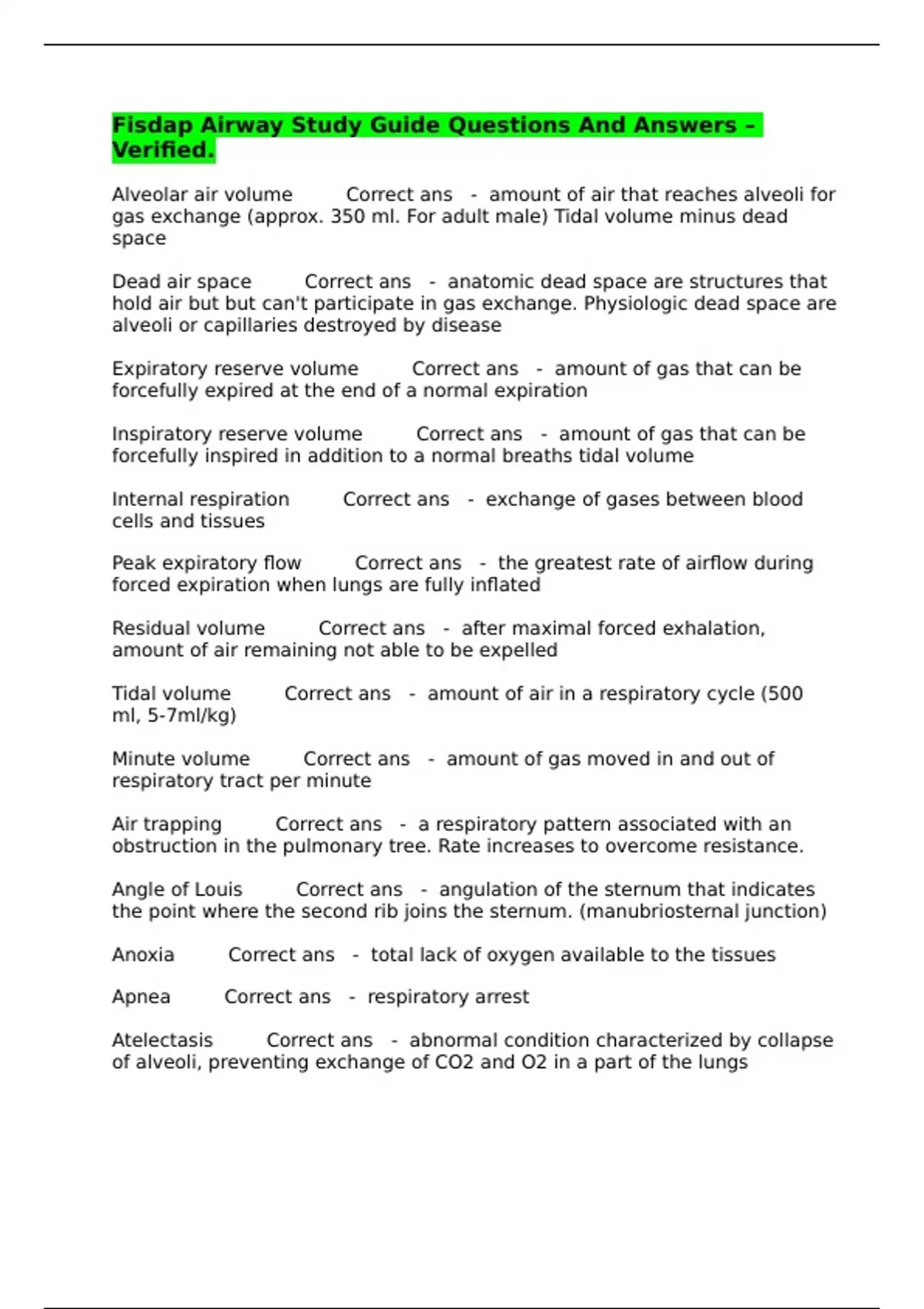 Fisdap Airway Study Guide Questions And Answers – Verified. Alveolar air volume Correct ans - amount of air that reaches alveoli for gas exchange (approx. 350 ml. For adult male) Tidal volume minus dead space Dead air space Correct ans - anatomic dead space are structures that hold air but but can't participate in gas exchange. Physiologic dead space are alveoli or capillaries destroyed by disease Expiratory reserve volume Correct ans - amount of gas that can be forcefully expired at the end of a normal expiration Inspiratory reserve volume Correct ans - amount of gas that can be forcefully inspired in addition to a normal breaths tidal volume Internal respiration Correct ans - exchange of gases between blood cells and tissues Peak expiratory flow Correct ans - the greatest rate of airflow during forced expiration when lungs are fully inflated Residual volume Correct ans - after maximal forced exhalation, amount of air remaining not able to be expelled Tidal volume Correct ans - amount of air in a respiratory cycle (500 ml, 5-7ml/kg) Minute volume Correct ans - amount of gas moved in and out of respiratory tract per minute Air trapping Correct ans - a respiratory pattern associated with an obstruction in the pulmonary tree. Rate increases to overcome resistance. Angle of Louis Correct ans - angulation of the sternum that indicates the point where the second rib joins the sternum. (manubriosternal junction) Anoxia Correct ans - total lack of oxygen available to the tissues Apnea Correct ans - respiratory arrest Atelectasis Correct ans - abnormal condition characterized by collapse of alveoli, preventing exchange of CO2 and O2 in a part of the lungs
