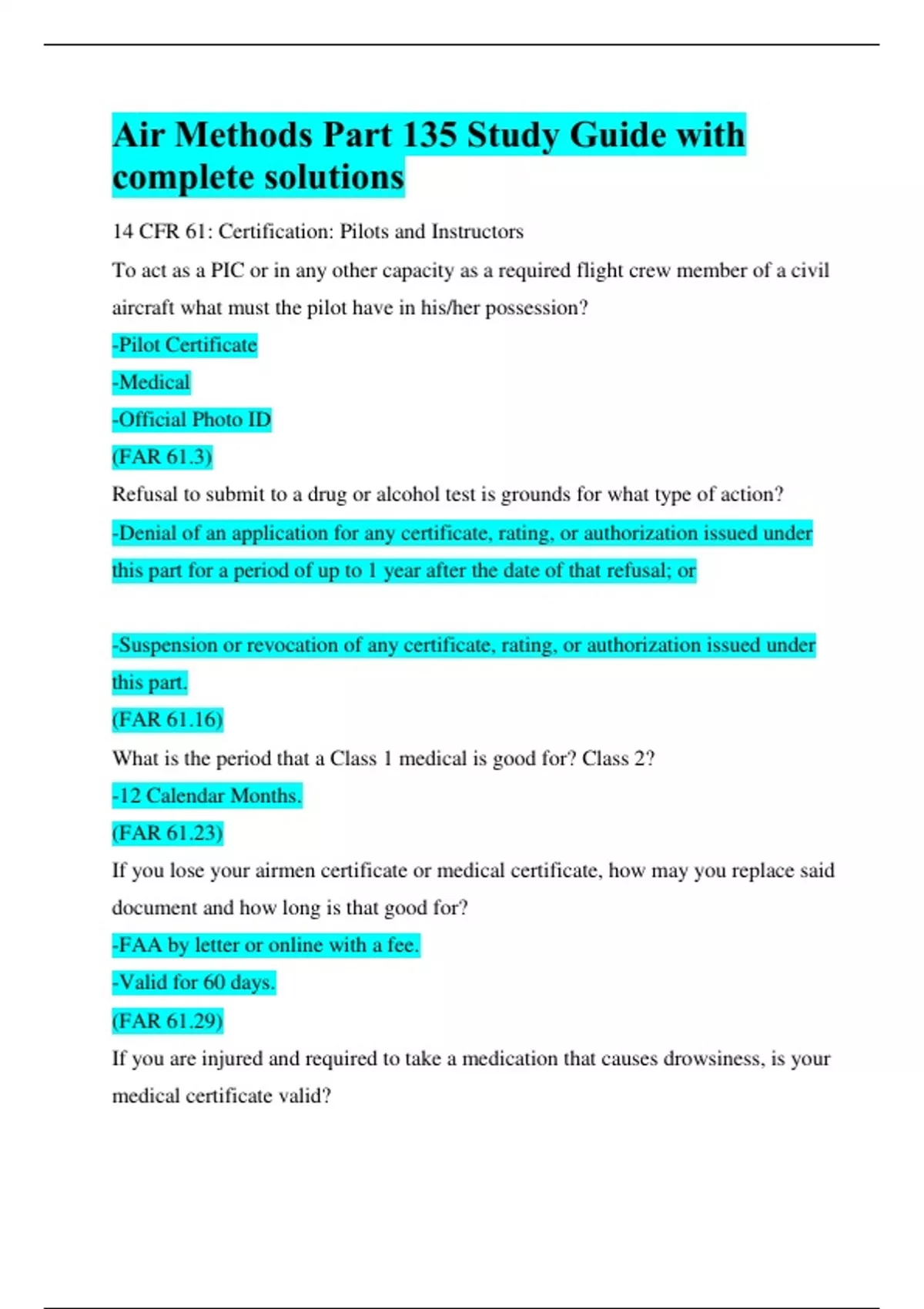 Air Methods Part 135 Study Guide with complete solutions Air Methods Part 135 Study Guide with complete solutions 14 CFR 61: Certification: Pilots and Instructors To act as a PIC or in any other capacity as a required flight crew member of a civil aircraft what must the pilot have in his/her possession? -Pilot Certificate -Medical -Official Photo ID (FAR 61.3) Refusal to submit to a drug or alcohol test is grounds for what type of action? -Denial of an application for any certificate, rating, or authorization issued under this part for a period of up to 1 year after the date of that refusal; or -Suspension or revocation of any certificate, rating, or authorization issued under this part. (FAR 61.16) What is the period that a Class 1 medical is good for? Class 2? -12 Calendar Months. (FAR 61.23) If you lose your airmen certificate or medical certificate, how may you replace said document and how long is that good for? -FAA by letter or online with a fee. -Valid for 60 days. (FAR 61.29) If you are injured and required to take a medication that causes drowsiness, is your medical certificate valid? No (FAR 61.53) If you falsify your Pilot Duty Logs, what action can be taken against you? Suspension of revocation of certificate (FAR 61.59) How long do you have to notify the FAA of a permanent change of address? 30 Days (FAR 61.60) 14 CFR 91: General Operating & Flight Rules A NASA ASRP form does not protect you in the case of what type(s) of offense(s)? Accidents or criminal offenses (FAR 91.25) You receive a flight that requires you to fly greater than 100 NM from your base site. What information must you obtain prior to accepting this flight? -Weather -Reports -Forecasts -Fuel requirements -Alternatives -Runways and Lengths (FAR 91.103) Why and how might you legally deviate from an accepted ATC clearance? -Amended clearance is obtained -An emergency exist -The deviation is in response to a traffic alert (FAR 91.123) Your route of flight will take you directly over the parking lot of a local stadium hosting the MLB All Star Game. What type of restrictive airspace will overlay this event? Are you allowed to fly through this on a PR flight? On a patient flight? There will be a TFR present over the event. Any sporting event with grater than 30,000 people, operations are prohibited within 3NM and 3000ft AGL. Medical Transportation operation may be except when warranted by the FAA administrator. (FAR 91.145) (99.7) What about flying directly over a stadium or sporting event is not listed in 91.145? Would a regular season game be protected as well? Where would you look to find the boundaries of such a protected area? Stadiums with 30,000 people, operations are prohibited within 3NM and 3000ft AGL. NOTAMS (FAR 91.145) (99.7) During preflight you notice the airworthiness certificate is faded, torn, and unreadable. What actions must you take? Can you legally operate the aircraft? No person may operate a civil aircraft unless the airworthiness certificate required by paragraph (a) of this section or a special flight authorization issued under §91.715 is displayed at the cabin or cockpit entrance so that it is legible to passengers or crew. (FAR 91.203) 14 CFR 135: Drug and Alcohol If you refuse to take a drug or alcohol test, what regulatory and administrative actions can be taken against you? -Denial of an application for any certificate or rating issued under this part for a period of up to 1 year after the date of that refusal; or -Suspension or revocation of any certificate or rating issued under this part (FAR 63.12.A) Does Air Methods, as a certificate holder, have any limitations on using an individual who has a prohibited drug in his/her system? The employer must not permit an employee who is required to hold an airman medical certificate under 14 CFR part 67 to perform a safety-sensitive duty to resume that duty Appendix I Part 121 What is the alcohol testing requirement for maintenance personnel? All employees who perform safety sensitive duties are required to the Alcohol/Drug testing program. Air Methods Anti Drug Training Manual Pg 8.0 You have inadvertently found yourself the cause, victim, or performer of a safety sensitive function of an aircraft that has just suffered a mishap. What are your restrictions from consuming alcohol following the mishap? The employee is prohibited from consuming alcohol with 8 hours following an accident/incident or prior to conducting a post accident alcohol test, whichever comes first. Air Methods Anti Drug Training Manual Pg 9.0 14 CFR 135: Commuter and On-Demand operations Give 3 examples of personnel whom the provisions of Part 135 are acceptable. Personnel employed by a commuter or on-demand operations certificate holder to include