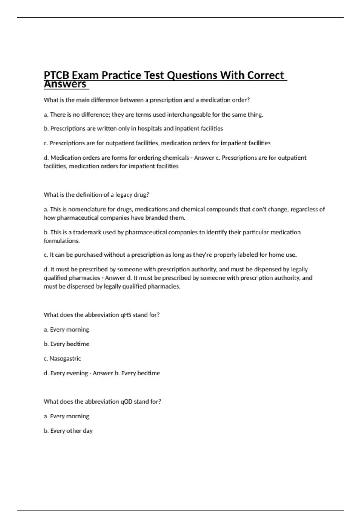 What is the main difference between a prescription and a medication order? a. There is no difference; they are terms used interchangeable for the same thing. b. Prescriptions are written only in hospitals and inpatient facilities c. Prescriptions are for outpatient facilities, medication orders for impatient facilities d. Medication orders are forms for ordering chemicals - Answer c. Prescriptions are for outpatient facilities, medication orders for impatient facilities What is the definition of a legacy drug? a. This is nomenclature for drugs, medications and chemical compounds that don't change, regardless of how pharmaceutical companies have branded them. b. This is a trademark used by pharmaceutical companies to identify their particular medication formulations. c. It can be purchased without a prescription as long as they're properly labeled for home use. d. It must be prescribed by someone with prescription authority, and must be dispensed by legally qualified pharmacies - Answer d. It must be prescribed by someone with prescription authority, and must be dispensed by legally qualified pharmacies. What does the abbreviation qHS stand for? a. Every morning b. Every bedtime c. Nasogastric d. Every evening - Answer b. Every bedtime What does the abbreviation qOD stand for? a. Every morning b. Every other day c. Every afternoon d. Twice a day - Answer b. Every other day What does the abbreviation DAW mean? a. Dispense as written b. Dextrose in water c. Divide by d. Distill always - Answer a. Dispense as written What does the abbreviation NS mean? a. Normal saline b. Not satisfactory c. Nausea d. No solution - Answer a. Normal saline What does the abbreviation a.m. mean? a. Take with food b. Atlantic meridian c. Morning d. Left ear - Answer c. Morning What does the abbreviation tbsp. mean? a. Tablespoon b. Teaspoon c. Tincture d. Evenings - Answer a. Tablespoon What does the abbreviation g mean? a. Glucose b. Gram c. Gallon d. Geodon - Answer b. Gram Which of the following is NOT an element of a medication order? a. The name of the patient b. The dosage form c. The rate and duration of indication of use d. The date and time of the order - Answer c. The rate and duration of the indication of use If a patient walks up to your retail pharmacy window and you've served them before, what do you need from them before you can begin processing their prescription? a. An identifying piece of information from them, such as their date of birth, address or phone number to confirm their identity b. A piece of state or federal identification such as a driver's license, passport, military ID card or Medicare/Medicaid card c. Their insurance information or a cash deposit, to be sure they can pay for the prescription before you go to the bother of processing it d. Information about significant health conditions they have - Answer a. An identifying piece of information from them, such as their date of birth, address or phone number to confirm their identity Which element will you find on a prescription that you won't usually find on a medication order? a. The DEA number b. The patient's name c. The route of administration d. The signature and credentials of the prescriber - Answer a. The DEA number Identify which statement about DEA numbers is TRUE. a. If the holder of the DEA number is a mid-level practitioner, the first letter will always be "A" and "B". b. The second letter of the DEA number is always the last letter of the holder's first name c. The seventh number is always the last number of the sum of the odd group and double the sum of the even group d. The first, third and fifth numbers are called the even group, and the second, fourth and sixth numbers are called the odd group - Answer c. The seventh number is always the last number of the sum of the odd group and double the sum of the even group Which of the following computer error screens does NOT exist? a. REFILL TO SOON b. NONFORMULARY/DRUG NOT COVERED c. DRUG-FOOD ADVERSE EFFECTS d. MISSING/INVALID ID - Answer c. DRUG-FOOD ADVERSE EFFECTS When is it acceptable to use abbreviations on a prescription label? a. Never use abbreviations on a prescription label b. It's okay if the prescription is written at an inpatient facility. c. It's okay to use only approved, easy-to-understand abbreviations on a prescription label d. Because prescription labels are so small, it's important to abbreviate as much as possible in order to fit the maximum amount of information - Answer a. Never use abbreviations on a prescription label Which regulatory agency is in charge of deciding which medications are classified as "restricted-use?" a. The Center for Disease Control b. The Food and Drug Administration c. The U.S. Pharmacologist's Pharmacopeia d. The United States Drug and Formulary Administration - Answer b. The Food and Drug Administration Which of these questions are you NOT LEGALLY allowed to answer as a pharmacy technician? a. "Is there a chance this drug will conflict with the St. John's Wort supplement I take every day?" b. "Is there a generic form of this drug?" c. "What size do these capsules come in?" d. "How many milliliters are there in an ounce?" - Answer a. "is there a chance this drug will conflict with the St. John's Wort supplement I take every day?"