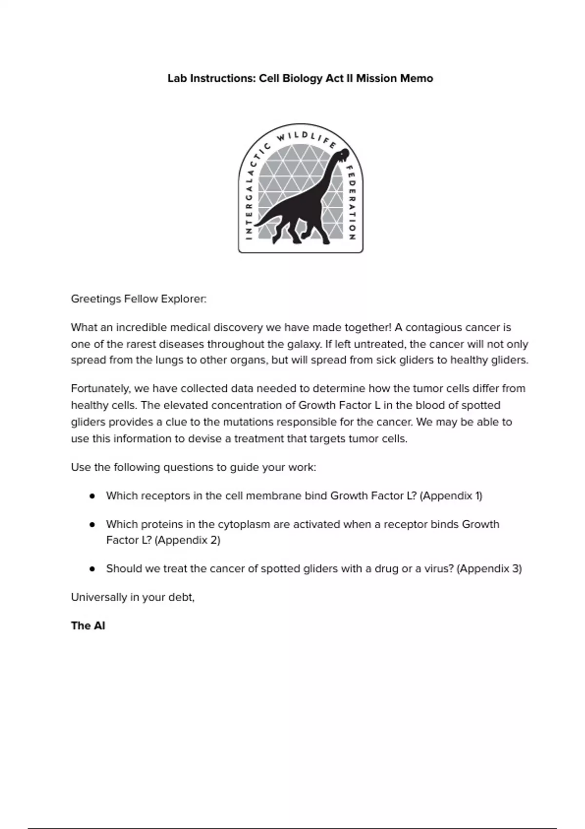 Lab Instructions: Cell Biology Act II Mission Memo Greetings Fellow Explorer: What an incredible medical discovery we have made together! A contagious cancer is one of the rarest diseases throughout the galaxy. If left untreated, the cancer will not only spread from the lungs to other organs, but will spread from sick gliders to healthy gliders. Fortunately, we have collected data needed to determine how the tumor cells differ from healthy cells. The elevated concentration of Growth Factor L in the blood of spotted gliders provides a clue to the mutations responsible for the cancer. We may be able to use this information to devise a treatment that targets tumor cells. Use the following questions to guide your work: ● Which receptors in the cell membrane bind Growth Factor L? (Appendix 1) ● Which proteins in the cytoplasm are activated when a receptor binds Growth Factor L? (Appendix 2) ● Should we treat the cancer of spotted gliders with a drug or a virus? (Appendix 3) Universally in your debt, The AI Note: You will be using the program Microsoft Excel for this assignment. We have provided links to Excel tutorials and transcripts where applicable, to help you answer the questions. Appendix 1 Which receptors in the cell membrane bind to Growth Factor L? Cancer—the uncontrolled growth of abnormal cells—results from a malfunction in a signaling pathway. The figure below shows a signaling pathway that regulates cell division in spotted gliders. When the signaling pathway is in the inactive state, a protein called CDI2 is in its active form and prevents the cell from dividing. All other proteins (R1, KR1, KR2, KR3, and CDP1) are in their inactive form. When the signaling pathway is in the active state, the following steps occur: 1) A signal (SR1) binds to a receptor (R1), activating this receptor through phosphorylation. 2) The active form of R1 binds and phosphorylates a kinase (KR1). 3) The active form of KR1 binds and phosphorylates a second kinase (KR2). 4) The active form of KR2 binds and phosphorylates a third kinase (KR3). 5) The active form of KR3 interacts directly with two proteins, CDP1 and CDI2. KR3 activates CDP1, which enables CDP1 to promote cell division. KR3 inactivates CDI2, preventing CDI2 from inhibiting cell division—thus enabling cell division to occur. Figure 1. The signaling pathway that regulates cell division in spotted gliders. Upper left: The signaling molecule (SR1) binds to the receptor (R1). Center: When no signaling molecule is bound to the receptor, most proteins in the signaling pathway are inactive, but a protein that represses cell division (CDI2) is active. Right: When a signaling molecule is bound to the receptor, most proteins in the signaling pathway become active. The first three proteins in the pathway (KR1-KR3) are activated by phosphorylation. The protein KR3 inactivates CDI2, which prevents CDI2 from inhibiting cell division. KR3 also activates CDP1, which directly promotes cell division. When examining the spotted gliders, we discovered an elevated concentration of a second type of signal, which Phygaran scientists called Growth Factor L (abbreviated as GF-L). According to my database, GF-L only reaches these concentrations during the embryonic stage early in the development of spotted gliders, when cells are rapidly dividing. By experimenting with some cells from a spotted glider, you discovered that GF-L binds to receptors in the membrane of a tumor cell. We might presume that these receptors are the same as R1, which would explain how GF-L promotes cell division (see Fig. 1). However, after you left the Intergalactic Wildlife Sanctuary, I analyzed the membrane of tumor cells and discovered a second type of receptor, R2, that has a similar structure to R1. According to research conducted on Phygaris, spotted gliders usually produce R2 as embryos when rapid cell division creates new tissues and organs. R2 is not usually expressed in adult gliders. We need to understand the role that GF-L plays in the cancer of spotted gliders. To begin, let’s determine whether GF-L binds to R1 or R2. This knowledge would help us identify the cause of the cancer. We will follow two steps to answer the question “Is Growth Factor L binding to Receptor 1 or Receptor 2?” Step 1: Anticipate your analysis: Determine what you should observe if GF-L binds to R1, R2, both receptors, or neither receptor. This step will help us identify the evidence needed to build an argument in Step 3. Step 2: Model the effects of GF-L on the activity of R1 and the activity of R2: Determine how the presence of GF-L affects the activity of R1 and the activity of R2. This step gives us the evidence needed to build an argument in Step 3, when we will conclude whether GF-L binds to R1, R2, both receptors, or neither receptor. Step 3: Weigh the evidence and conclude if GF-L binds to R1, R2, both receptors, or neither receptor: Construct an argument to answer the question “Does GF-L bind only to R1, only to R2, both receptors, or neither receptor?” Your argument should draw on your answers in Steps 1 and 2.