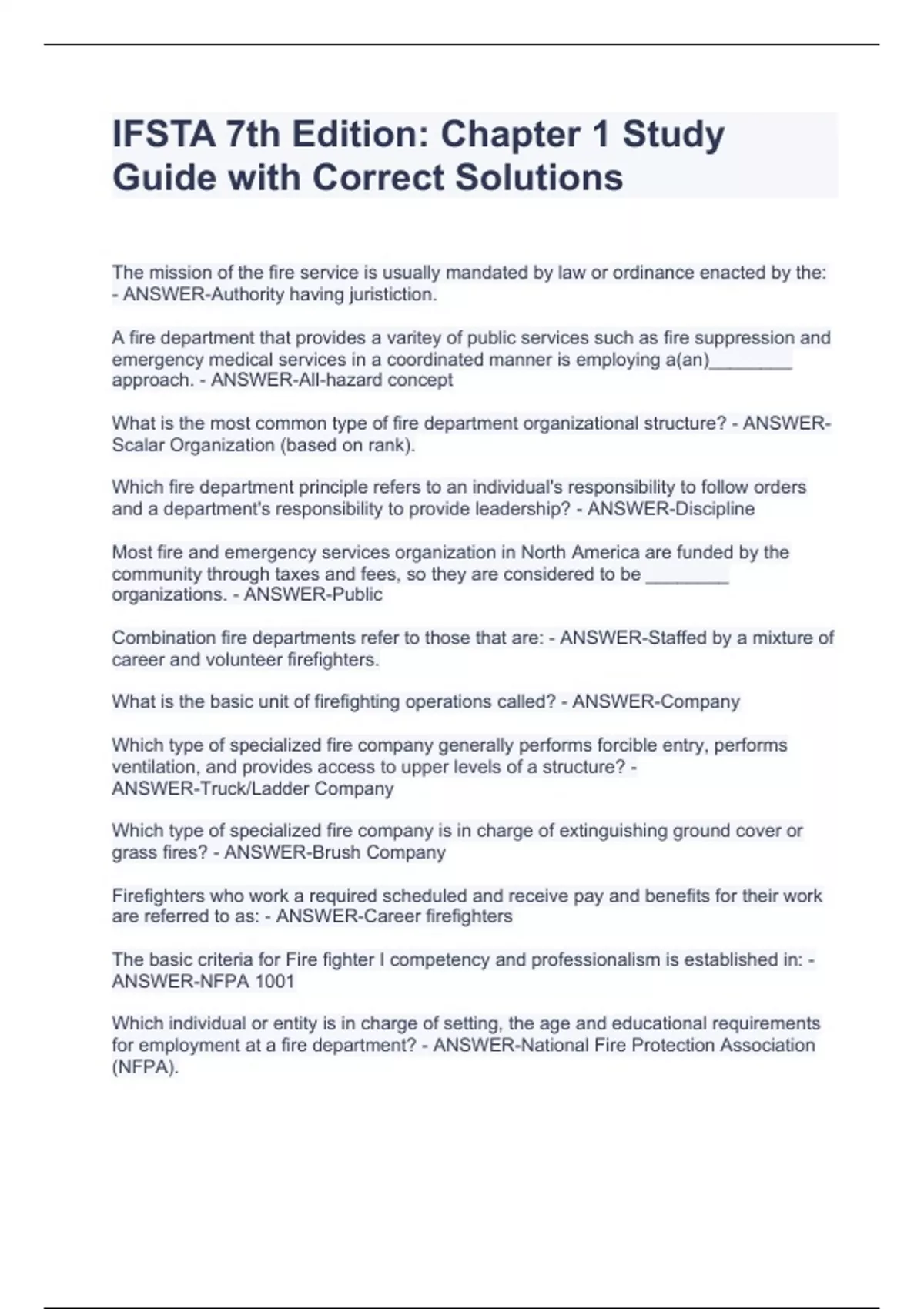 IFSTA 7th Edition: Chapter 1 Study Guide with Correct Solutions IFSTA 7th Edition: Chapter 1 Study Guide with Correct Solutions IFSTA 7th Edition: Chapter 1 Study Guide with Correct Solutions The mission of the fire service is usually mandated by law or ordinance enacted by the: - ANSWER-Authority having juristiction. A fire department that provides a varitey of public services such as fire suppression and emergency medical services in a coordinated manner is employing a(an)________ approach. - ANSWER-All-hazard concept What is the most common type of fire department organizational structure? - ANSWER-Scalar Organization (based on rank). Which fire department principle refers to an individual's responsibility to follow orders and a department's responsibility to provide leadership? - ANSWER-Discipline Most fire and emergency services organization in North America are funded by the community through taxes and fees, so they are considered to be ________ organizations. - ANSWER-Public