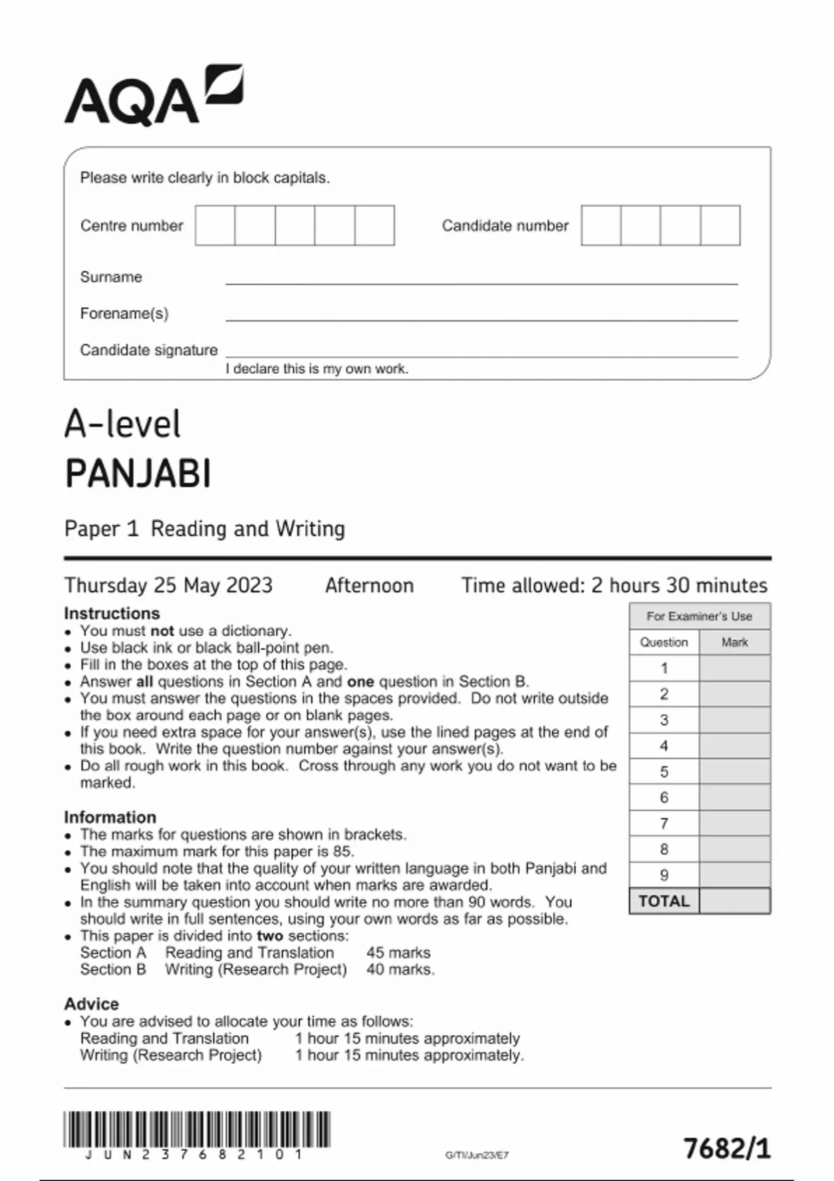 AQA A LEVEL PANJABI PAPER 1 MAY 2023 QUESTION PAPER (7682-1:Reading and Writing)