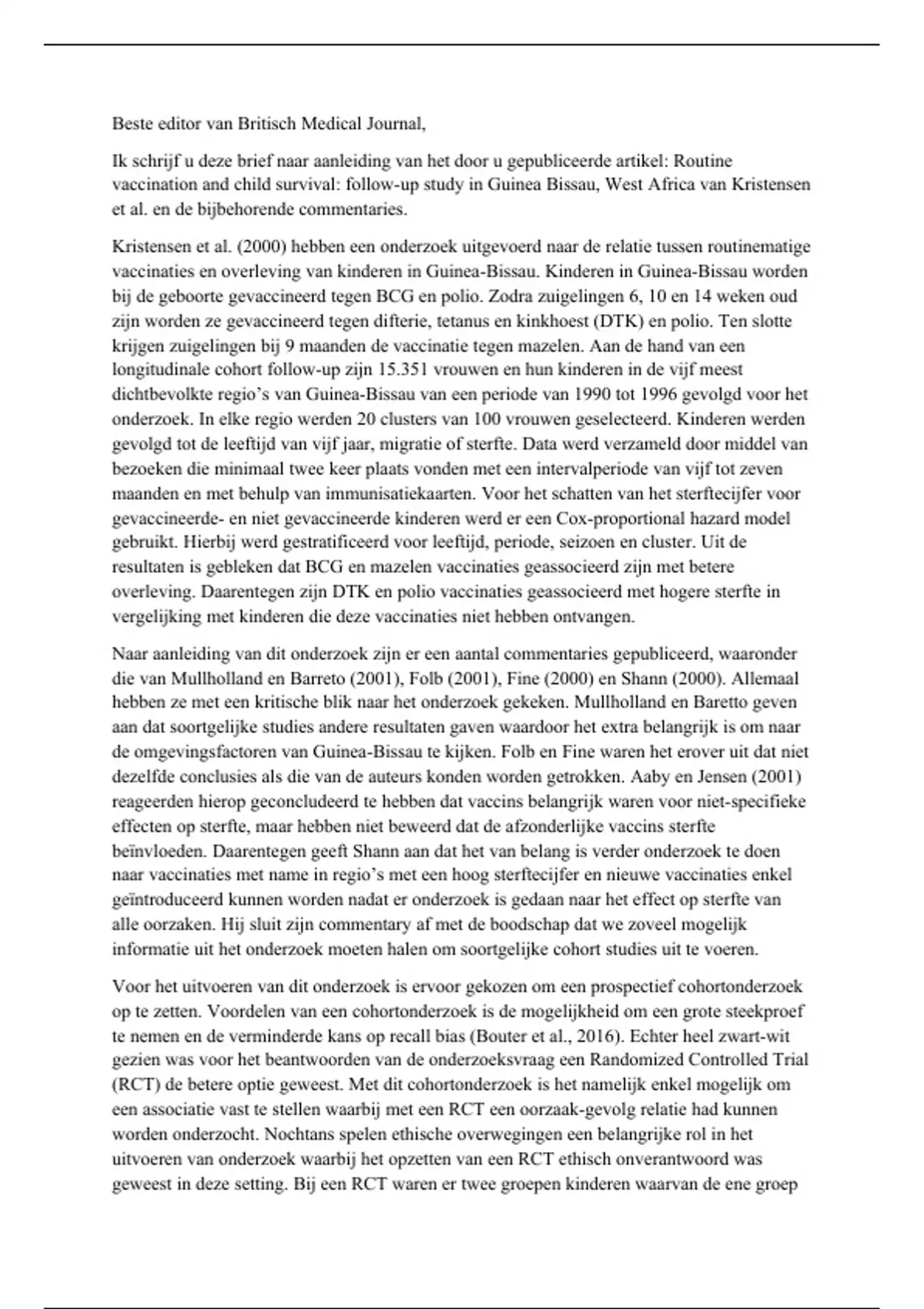 Het doel van dit take home tentamen was om een onderzoek naar vaccinaties in een laag-inkomensland te beoordelen. Hierbij worden sterke en zwakke punten van het onderzoek benoemd die zijn onderbouwd met literatuur. Tot slot is een conclusie getrokken of het artikel behouden moet worden of uit de journal moet worden gehaald. Deze brief is met een 7,8 beoordeeld!