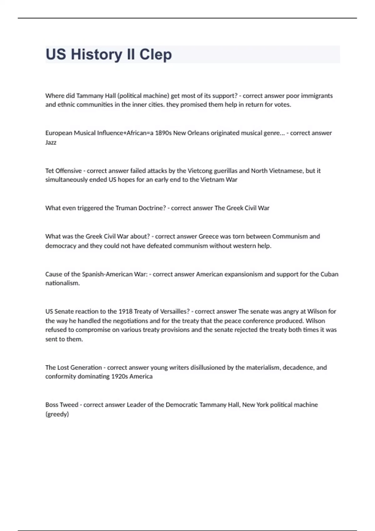 US History II ClepWhere did Tammany Hall (political machine) get most of its support? - correct answer poor immigrants and ethnic communities in the inner cities. they promised them help in return for votes. European Musical Influence+African=a 1890s New Orleans originated musical genre... - correct answer Jazz Tet Offensive - correct answer failed attacks by the Vietcong guerillas and North Vietnamese, but it simultaneously ended US hopes for an early end to the Vietnam War What even triggered the Truman Doctrine? - correct answer The Greek Civil War What was the Greek Civil War about? - correct answer Greece was torn between Communism and democracy and they could not have defeated communism without western help. Cause of the Spanish-American War: - correct answer American expansionism and support for the Cuban nationalism. US Senate reaction to the 1918 Treaty of Versailles? - correct answer The senate was angry at Wilson for the way he handled the negotiations and for the treaty that the peace conference produced. Wilson refused to compromise on various treaty provisions and the senate rejected the treaty both times it was sent to them. The Lost Generation - correct answer young writers disillusioned by the materialism, decadence, and conformity dominating 1920s America Boss Tweed - correct answer Leader of the Democratic Tammany Hall, New York political machine (greedy)