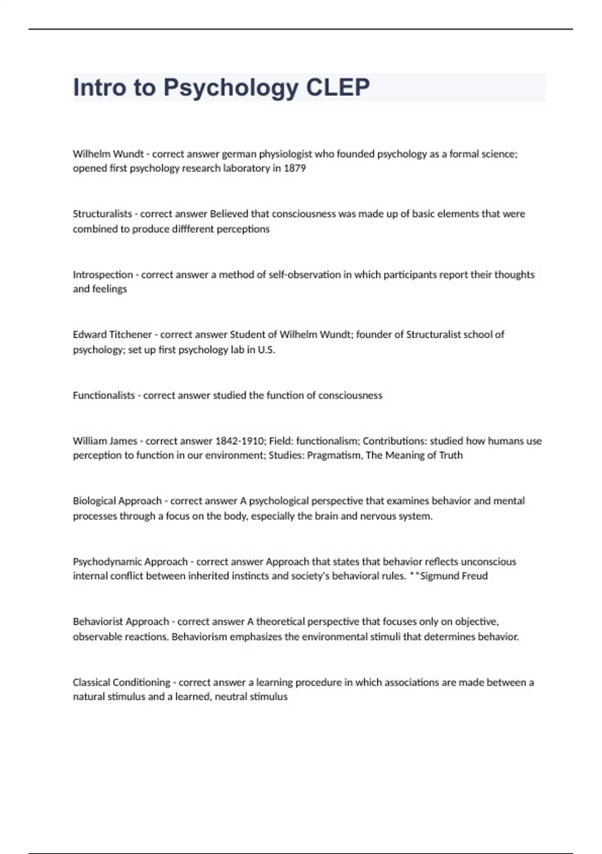 Intro to Psychology CLEPWilhelm Wundt - correct answer german physiologist who founded psychology as a formal science; opened first psychology research laboratory in 1879 Structuralists - correct answer Believed that consciousness was made up of basic elements that were combined to produce diffferent perceptions Introspection - correct answer a method of self-observation in which participants report their thoughts and feelings Edward Titchener - correct answer Student of Wilhelm Wundt; founder of Structuralist school of psychology; set up first psychology lab in U.S. Functionalists - correct answer studied the function of consciousness William James - correct answer ; Field: functionalism; Contributions: studied how humans use perception to function in our environment; Studies: Pragmatism, The Meaning of Truth Biological Approach - correct answer A psychological perspective that examines behavior and mental processes through a focus on the body, especially the brain and nervous system. Psychodynamic Approach - correct answer Approach that states that behavior reflects unconscious internal conflict between inherited instincts and society's behavioral rules. **Sigmund Freud Behaviorist Approach - correct answer A theoretical perspective that focuses only on objective, observable reactions. Behaviorism emphasizes the environmental stimuli that determines behavior. Classical Conditioning - correct answer a learning procedure in which associations are made between a natural stimulus and a learned, neutral stimulus