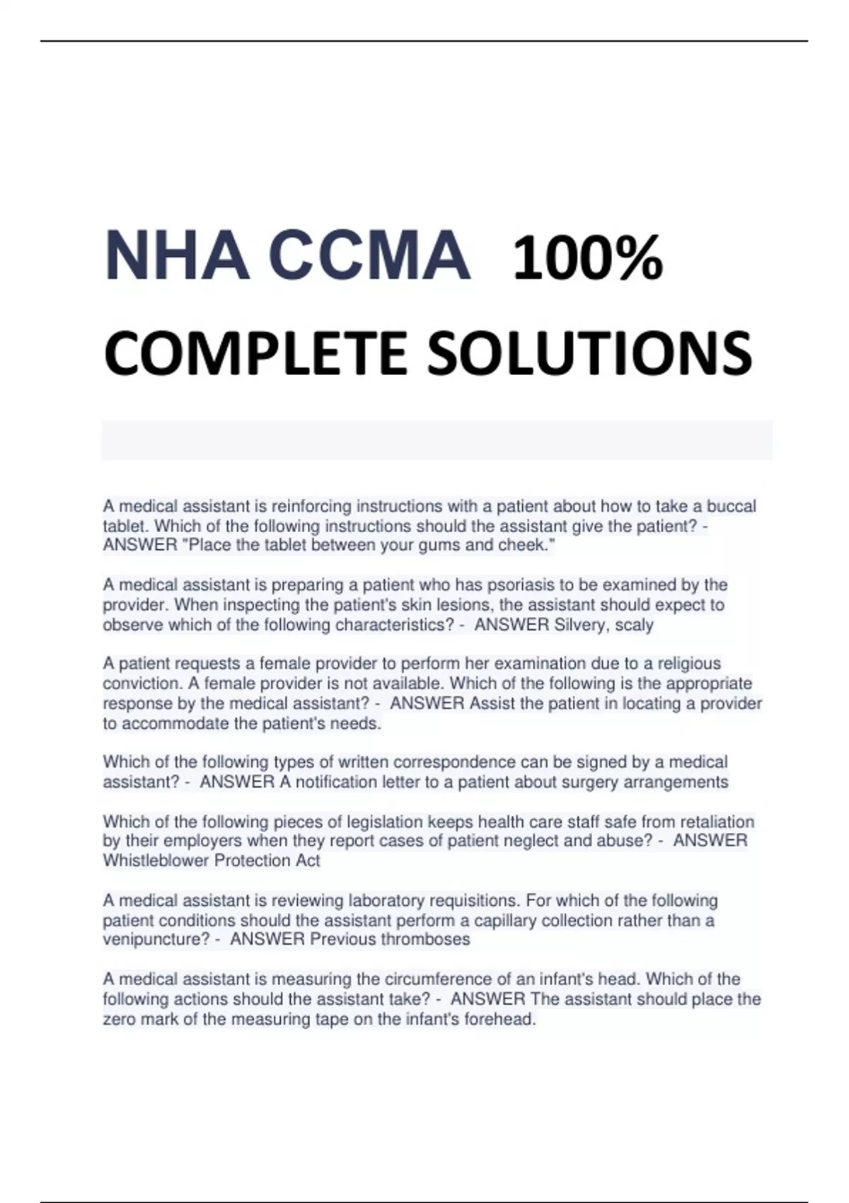 NHA CCMA 100% COMPLETE SOLUTIONS A medical assistant is reinforcing instructions with a patient about how to take a buccal tablet. Which of the following instructions should the assistant give the patient? - ANSWER "Place the tablet between your gums and cheek." A medical assistant is preparing a patient who has psoriasis to be examined by the provider. When inspecting the patient's skin lesions, the assistant should expect to observe which of the following characteristics? - ANSWER Silvery, scaly A patient requests a female provider to perform her examination due to a religious conviction. A female provider is not available. Which of the following is the appropriate response by the medical assistant? - ANSWER Assist the patient in locating a provider to accommodate the patient's needs. Which of the following types of written correspondence can be signed by a medical assistant? - ANSWER A notification letter to a patient about surgery arrangements Which of the following pieces of legislation keeps health care staff safe from retaliation by their employers when they report cases of patient neglect and abuse? - ANSWER Whistleblower Protection Act A medical assistant is reviewing laboratory requisitions. For which of the following patient conditions should the assistant perform a capillary collection rather than a venipuncture? - ANSWER Previous thromboses A medical assistant is measuring the circumference of an infant's head. Which of the following actions should the assistant take? - ANSWER The assistant should place the zero mark of the measuring tape on the infant's forehead. Which of the following is a medical assistant's role in pulmonary function testing (PFT)? - ANSWER Coach the patient through the test. Which of the following items in a medical office are considered administrative office supplies? - ANSWER Letterhead, envelopes, and business cards A medical assistant is composing business correspondence using the simplified letter style. Which of the following features should the assistant use? - ANSWER A subject line in all capital letters A medical assistant is performing a review of items in a clinic's inventory. How should the assistant classify dressings and bandages for inventory purposes? - ANSWER As clinical supplies A medical assistant is caring for a child who has varicella zoster virus. The assistant should recognize that varicella is transferred through which of the following modes of transmission? - ANSWER Airborne When completing documentation in a patient's paper medical record, a medical assistant realizes she made an error. Which of the following actions should the assistant take? - ANSWER Draw a line through the error and initial it. (The assistant should draw a line through the error, insert the correction, write the date next to the correction, and initial or sign the correction) A patient asks a medical assistant to explain the difference between a liniment and a medicated lotion. Which of the following responses should the assistant make? - ANSWER "Liniments contain a higher portion of oil than medicated lotions." A medical assistant is measuring the vital signs of an adult patient. The assistant should identify which of the following blood pressure readings as stage 2 hypertension? - ANSWER 150/95 mm Hg According to OSHA guidelines for universal precautions, which of the following types of patient contact would require a medical assistant to wear gloves, a mask, a face shield, and protective apparel? - ANSWER Assisting a provider with the removal of a cyst A medical assistant is reinforcing teaching with a patient about pulse oximetry. Which of the following statements should the assistant include in the teaching? - ANSWER "Remove your nail polish before the test. A medical assistant is reinforcing teaching with a patient about the self-administration of insulin injections. Which of the following patient statements indicates an understanding of the teaching? - ANSWER "I will roll the bottle between my hands before drawing the medication.