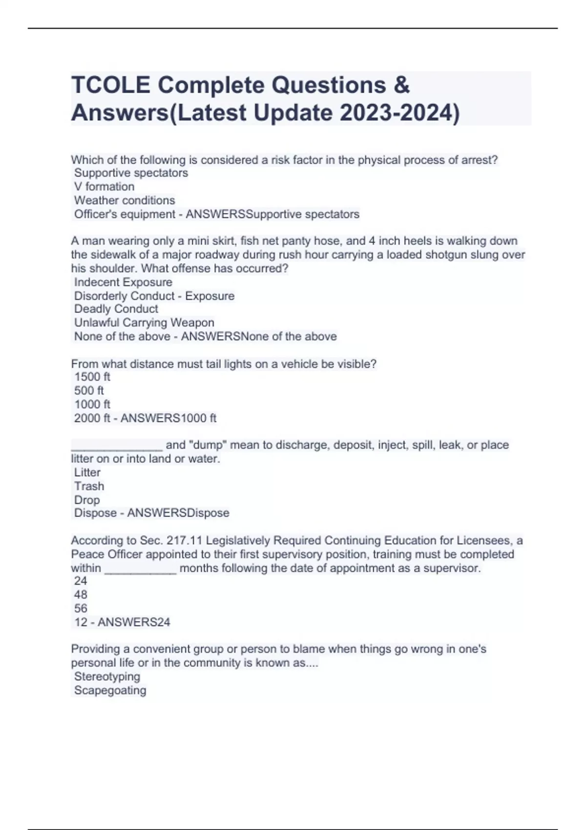 Which of the following is considered a risk factor in the physical process of arrest? Supportive spectators V formation Weather conditions Officer's equipment - ANSWERSSupportive spectators A man wearing only a mini skirt, fish net panty hose, and 4 inch heels is walking down the sidewalk of a major roadway during rush hour carrying a loaded shotgun slung over his shoulder. What offense has occurred? Indecent Exposure Disorderly Conduct - Exposure Deadly Conduct Unlawful Carrying Weapon None of the above - ANSWERSNone of the above From what distance must tail lights on a vehicle be visible? 1500 ft 500 ft 1000 ft 2000 ft - ANSWERS1000 ft ______________ and "dump" mean to discharge, deposit, inject, spill, leak, or place litter on or into land or water. Litter Trash Drop Dispose - ANSWERSDispose According to Sec. 217.11 Legislatively Required Continuing Education for Licensees, a Peace Officer appointed to their first supervisory position, training must be completed within ___________ months following the date of appointment as a supervisor. 24 48 56 12 - ANSWERS24
