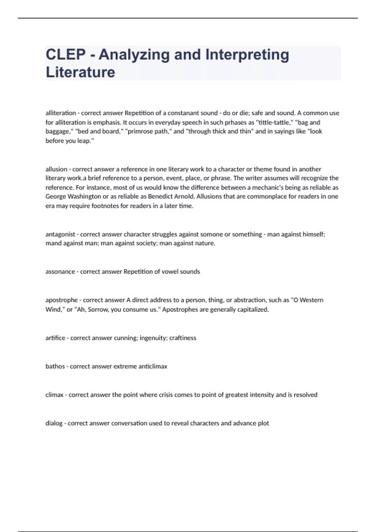 CLEP - Analyzing and Interpreting Literaturealliteration - correct answer Repetition of a constanant sound - do or die; safe and sound. A common use for alliteration is emphasis. It occurs in everyday speech in such prhases as "tittle-tattle," "bag and baggage," "bed and board," "primrose path," and "through thick and thin" and in sayings like "look before you leap." allusion - correct answer a reference in one literary work to a character or theme found in another literary work.a brief reference to a person, event, place, or phrase. The writer assumes will recognize the reference. For instance, most of us would know the difference between a mechanic's being as reliable as George Washington or as reliable as Benedict Arnold. Allusions that are commonplace for readers in one era may require footnotes for readers in a later time. antagonist - correct answer character struggles against somone or something - man against himself; mand against man; man against society; man against nature. assonance - correct answer Repetition of vowel sounds apostrophe - correct answer A direct address to a person, thing, or abstraction, such as "O Western Wind," or "Ah, Sorrow, you consume us." Apostrophes are generally capitalized. artifice - correct answer cunning; ingenuity; craftiness bathos - correct answer extreme anticlimax climax - correct answer the point where crisis comes to point of greatest intensity and is resolved dialog - correct answer conversation used to reveal characters and advance plot