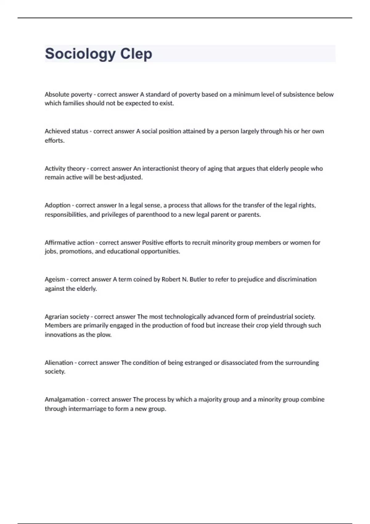 Sociology ClepAbsolute poverty - correct answer A standard of poverty based on a minimum level of subsistence below which families should not be expected to exist. Achieved status - correct answer A social position attained by a person largely through his or her own efforts. Activity theory - correct answer An interactionist theory of aging that argues that elderly people who remain active will be best-adjusted. Adoption - correct answer In a legal sense, a process that allows for the transfer of the legal rights, responsibilities, and privileges of parenthood to a new legal parent or parents. Affirmative action - correct answer Positive efforts to recruit minority group members or women for jobs, promotions, and educational opportunities. Ageism - correct answer A term coined by Robert N. Butler to refer to prejudice and discrimination against the elderly. Agrarian society - correct answer The most technologically advanced form of preindustrial society. Members are primarily engaged in the production of food but increase their crop yield through such innovations as the plow. Alienation - correct answer The condition of being estranged or disassociated from the surrounding society. Amalgamation - correct answer The process by which a majority group and a minority group combine through intermarriage to form a new group.