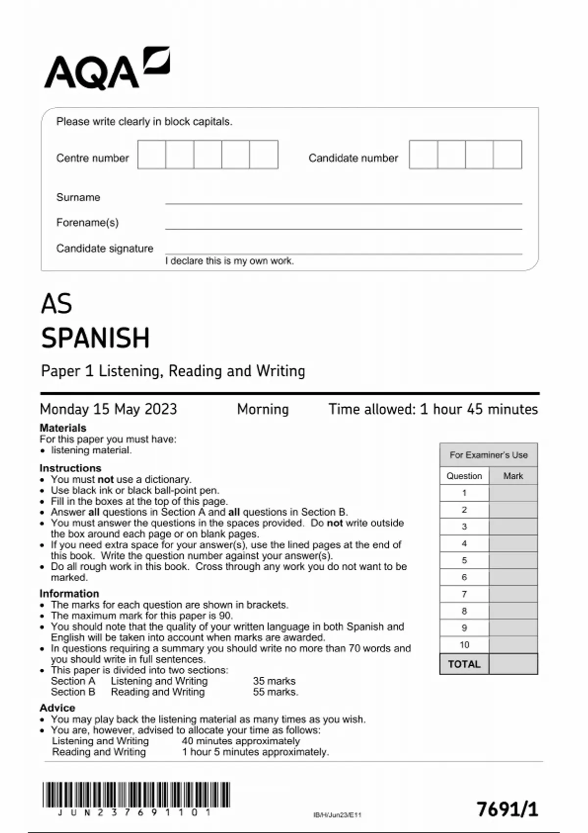 AQA AS SPANISH PAPER 1 MAY 2023 QUESTION PAPER (7691/1:Listening, Reading and Writing)