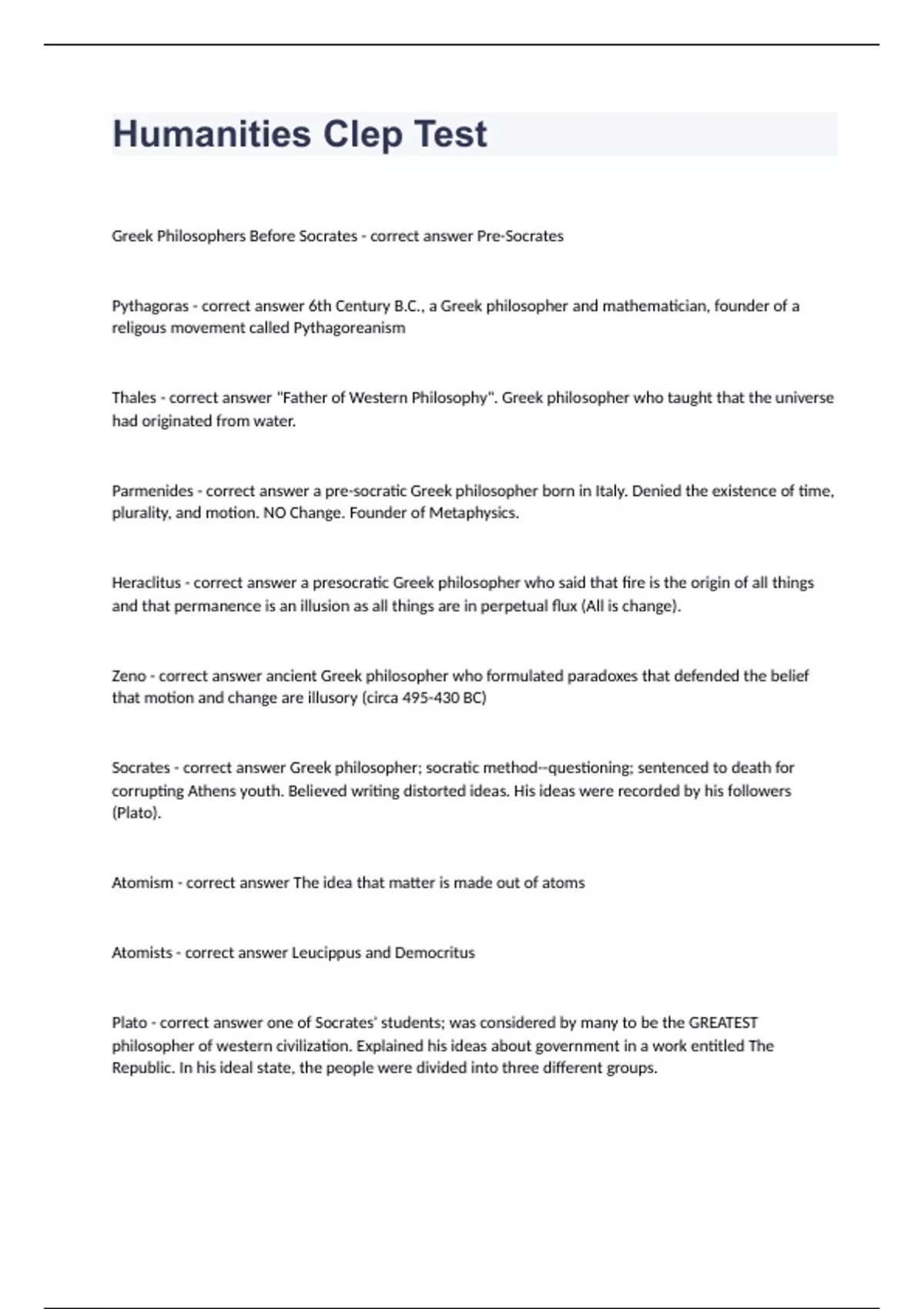 Humanities Clep TestGreek Philosophers Before Socrates - correct answer Pre-Socrates Pythagoras - correct answer 6th Century B.C., a Greek philosopher and mathematician, founder of a religous movement called Pythagoreanism Thales - correct answer "Father of Western Philosophy". Greek philosopher who taught that the universe had originated from water. Parmenides - correct answer a pre-socratic Greek philosopher born in Italy. Denied the existence of time, plurality, and motion. NO Change. Founder of Metaphysics. Heraclitus - correct answer a presocratic Greek philosopher who said that fire is the origin of all things and that permanence is an illusion as all things are in perpetual flux (All is change). Zeno - correct answer ancient Greek philosopher who formulated paradoxes that defended the belief that motion and change are illusory (circa 495-430 BC) Socrates - correct answer Greek philosopher; socratic method--questioning; sentenced to death for corrupting Athens youth. Believed writing distorted ideas. His ideas were recorded by his followers (Plato).