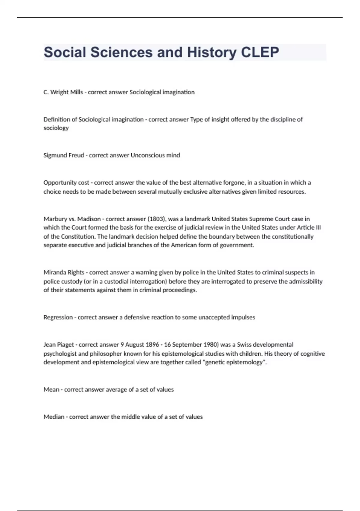 Social Sciences and History CLEPC. Wright Mills - correct answer Sociological imagination Definition of Sociological imagination - correct answer Type of insight offered by the discipline of sociology Sigmund Freud - correct answer Unconscious mind Opportunity cost - correct answer the value of the best alternative forgone, in a situation in which a choice needs to be made between several mutually exclusive alternatives given limited resources. Marbury vs. Madison - correct answer (1803), was a landmark United States Supreme Court case in which the Court formed the basis for the exercise of judicial review in the United States under Article III of the Constitution. The landmark decision helped define the boundary between the constitutionally separate executive and judicial branches of the American form of government. Miranda Rights - correct answer a warning given by police in the United States to criminal suspects in police custody (or in a custodial interrogation) before they are interrogated to preserve the admissibility of their statements against them in criminal proceedings. Regression - correct answer a defensive reaction to some unaccepted impulses Jean Piaget - correct answer 9 August 1896 - 16 September 1980) was a Swiss developmental psychologist and philosopher known for his epistemological studies with children. His theory of cognitive development and epistemological view are together called "genetic epistemology". Mean - correct answer average of a set of values Median - correct answer the middle value of a set of values