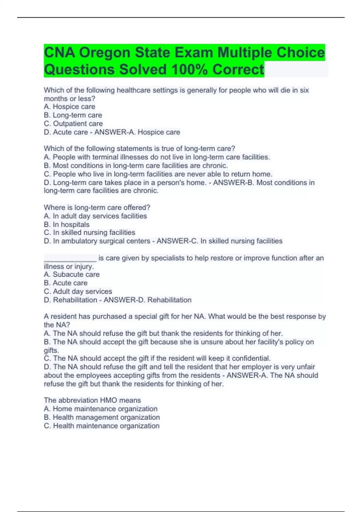 Which of the following healthcare settings is generally for people who will die in six months or less? A. Hospice care B. Long-term care C. Outpatient care D. Acute care - ANSWER-A. Hospice care Which of the following statements is true of long-term care? A. People with terminal illnesses do not live in long-term care facilities. B. Most conditions in long-term care facilities are chronic. C. People who live in long-term facilities are never able to return home. D. Long-term care takes place in a person's home. - ANSWER-B. Most conditions in long-term care facilities are chronic. Where is long-term care offered? A. In adult day services facilities B. In hospitals C. In skilled nursing facilities D. In ambulatory surgical centers - ANSWER-C. In skilled nursing facilities _____________ is care given by specialists to help restore or improve function after an illness or injury. A. Subacute care B. Acute care C. Adult day services D. Rehabilitation - ANSWER-D. Rehabilitation A resident has purchased a special gift for her NA. What would be the best response by the NA? A. The NA should refuse the gift but thank the residents for thinking of her. B. The NA should accept the gift because she is unsure about her facility's policy on gifts. C. The NA should accept the gift if the resident will keep it confidential. D. The NA should refuse the gift and tell the resident that her employer is very unfair about the employees accepting gifts from the residents - ANSWER-A. The NA should refuse the gift but thank the residents for thinking of her. The abbreviation HMO means A. Home maintenance organization B. Health management organization C. Health maintenance organization D. Home medical organization - ANSWER-C. Health maintenance organization The group with the longest average stay in long-term care facilities is A. Men B. Developmentally disabled C. Caregivers D. Residents with heart disease - ANSWER-B. Developmentally disabled Which of the following statements is true of acute care? A. Acute care is normally given in adult day services facilities B. One advantage of acute care is people do not have to leave their homes to receive it. C. Acute care is given to people who do not have a serious illness. D. Acute care is given in hospitals for people who require immediate care. - ANSWER-D. Acute care is given in hospitals for people who require immediate care. A _______ is a method or way of doing something. A. Policy B. Procedure C. Survey D. Cite - ANSWER-B. Procedure Medicare will pay for A. All care requested by the recipient B. All care requested by the doctor C. All care requested by the long-term care facility D. Only care that it determines to be medically necessary - ANSWER-D. Only care that it determines to be medically necessary ______________ is a medical assistance program for low-income people. A. Medicare B. Medicaid C. CMS D. OSHA - ANSWER-B. Medicaid Regular inspections performed in facilities to make sure they are following state and federal regulations are called A. Surveys B. Citations C. Procedures D. Licenses - ANSWER-A. Surveys Which of the following is a core value associated with culture change? A. Doing everything for residents B. Treating all residents the same way C. Promoting self-determination and personal choice D. Making sure all residents participate in the same activities - ANSWER-C. Promoting self-determination and personal choice Which member of the care team diagnoses disease and prescribes treatment? A. Nursing assistant (NA) B. Resident C. Physician (MD) D. Dietitian (RDT) - ANSWER-C. Physician (MD) Which of the following care team members are licensed professionals who delegate jobs to nursing assistants? A. NAs, nurses B. Resident's family C. Nurses, PTs, OTs D. NAs, physicians - ANSWER-C. Nurses, PTs, OTs Which of the following statements is true of residents as a part of the care team? A. Residents cannot make their own decisions B. Residents are not care team members C. Residents should not try to make choices about the care they want to receive D. The care team revolves around the resident and his or her condition, treatment, and progress - ANSWER-D. The care team revolves around the resident and his or her condition, treatment, and progress Which of the following statements is true of a nursing assistant's responsibilities if an activity is not listed in the care plan? A. The NA should not perform the activity if it is not listed on the care plan B. The NA should perform the activity if he or she believes it is best for the resident C. The NA should only perform the activity if the resident says he wants it performed D. The NA should consult other NAs to see if they would perform the activity - ANSWER-A. The NA should not perform the activity if it is not listed on the care plan What is one reason why reporting a resident's changes and problems to the supervisor is a very important role of the nursing assistant? A. The care plan must be updated as the resident's condition changes. B. Reporting changes is not a task that the NA performs. C. Depending on the resident's changes, the NA can decide if she wants to work that day or not. D. The NA can decide what medication to prescribe for the resident's current condition. - ANSWER-A. The care plan must be updated as the resident's condition changes. Which of the following is a typical task that an NA performs? A. Changing a sterile dressing on an open wound B. Helping residents with elimination needs C. Administering medication D. Prescribing treatments - ANSWER-B. Helping residents with elimination needs