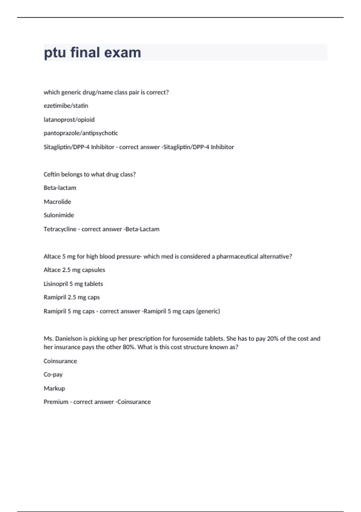 which generic drug/name class pair is correct? ezetimibe/statin latanoprost/opioid pantoprazole/antipsychotic Sitagliptin/DPP-4 Inhibitor - correct answer -Sitagliptin/DPP-4 Inhibitor Ceftin belongs to what drug class? Beta-lactam Macrolide Sulonimide Tetracycline - correct answer -Beta-Lactam Altace 5 mg for high blood pressure- which med is considered a pharmaceutical alternative? Altace 2.5 mg capsules Lisinopril 5 mg tablets Ramipril 2.5 mg caps Ramipril 5 mg caps - correct answer -Ramipril 5 mg caps (generic) Ms. Danielson is picking up her prescription for furosemide tablets. She has to pay 20% of the cost and her insurance pays the other 80%. What is this cost structure known as? Coinsurance Co-pay Markup