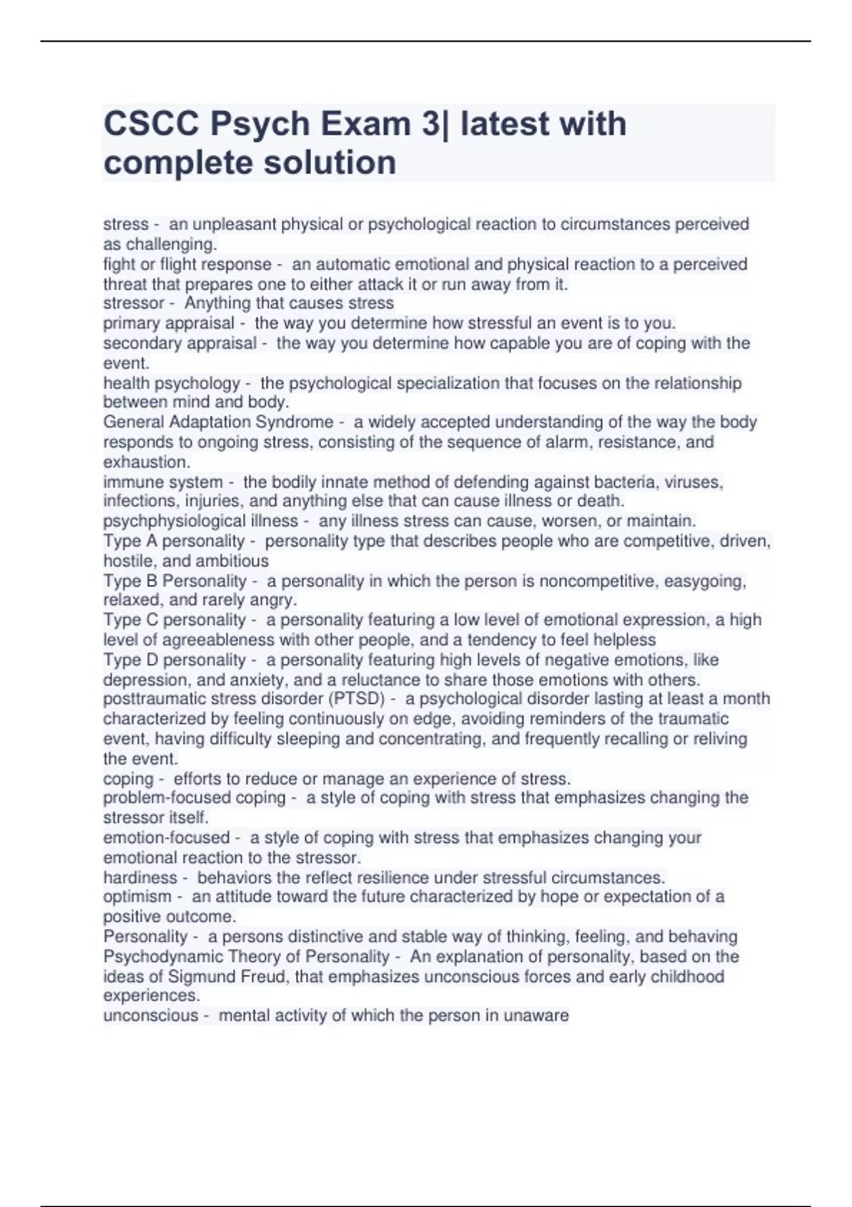 CSCC Psych Exam 3| latest with complete solution stress - an unpleasant physical or psychological reaction to circumstances perceived as challenging. fight or flight response - an automatic emotional and physical reaction to a perceived threat that prepares one to either attack it or run away from it. stressor - Anything that causes stress primary appraisal - the way you determine how stressful an event is to you. secondary appraisal - the way you determine how capable you are of coping with the event. health psychology - the psychological specialization that focuses on the relationship between mind and body. General Adaptation Syndrome - a widely accepted understanding of the way the body responds to ongoing stress, consisting of the sequence of alarm, resistance, and exhaustion. immune system - the bodily innate method of defending against bacteria, viruses, infections, injuries, and anything else that can cause illness or death. psychphysiological illness - any illness stress can cause, worsen, or maintain. Type A personality - personality type that describes people who are competitive, driven, hostile, and ambitious Type B Personality - a personality in which the person is noncompetitive, easygoing, relaxed, and rarely angry. Type C personality - a personality featuring a low level of emotional expression, a high level of agreeableness with other people, and a tendency to feel helpless Type D personality - a personality featuring high levels of negative emotions, like depression, and anxiety, and a reluctance to share those emotions with others. posttraumatic stress disorder (PTSD) - a psychological disorder lasting at least a month characterized by feeling continuously on edge, avoiding reminders of the traumatic event, having difficulty sleeping and concentrating, and frequently recalling or reliving the event. coping - efforts to reduce or manage an experience of stress. problem-focused coping - a style of coping with stress that emphasizes changing the stressor itself. emotion-focused - a style of coping with stress that emphasizes changing your emotional reaction to the stressor. hardiness - behaviors the reflect resilience under stressful circumstances. optimism - an attitude toward the future characterized by hope or expectation of a positive outcome. Personality - a persons distinctive and stable way of thinking, feeling, and behaving Psychodynamic Theory of Personality - An explanation of personality, based on the ideas of Sigmund Freud, that emphasizes unconscious forces and early childhood experiences. unconscious - mental activity of which the person in unaware Freudian slips - Verbal or behavioral mistakes reveal unconscious wishes and thoughts Id - According to Freud, the animalistic part of the mind that generates our most basic, biologically based impulses, such as sex and aggression Ego - According to Freud, the part of the mind that serves as a realistic mediator between the id and the superego. Superego - According to Freud, the part of the mind that opposes the id by enforcing rules, restrictions, and morality. defense mechanisms - According to Freud, techniques used by the ego to manage conflict between the id and superego. Repression - a type of defense mechanism where the ego hides your id impulse in the unconscious to keep you unaware of it Denial - a type of defense mechanism where the ego blocks external events from consciousness because they are too threating. Displacement - a type of defense mechanism where the ego redirects the id impulse toward a safer target in order to minimize the consequences to you Sublimation - A type of defense mechanism where the ego redirects the id impulse in a way that actually benefits others psychosexual stages - Freud's five biologically based developmental stages of childhood, during which personality characteristics are formed. fixation - Freud's term for a lingering psychological problem directly related to unsuccessful experience of a particular psychological stage Oral Stage (0-18 months) - The first of Freud's psychosexual stages which focuses on the consequences of feeding behavior. Anal Stage (18 months - 3 years) - Freud's second psychosexual stage which focuses on the psychological consequences of toilet training. Phallic Stage (3-6 years) - Freud's third psychosexual stage which focuses on the psychological consequences of attraction to the opposite sex parent. Oedipus complex - The childhood experience of desiring the mother and resenting the father Latency (6 to puberty) - Freud's fourth psychosexual stage