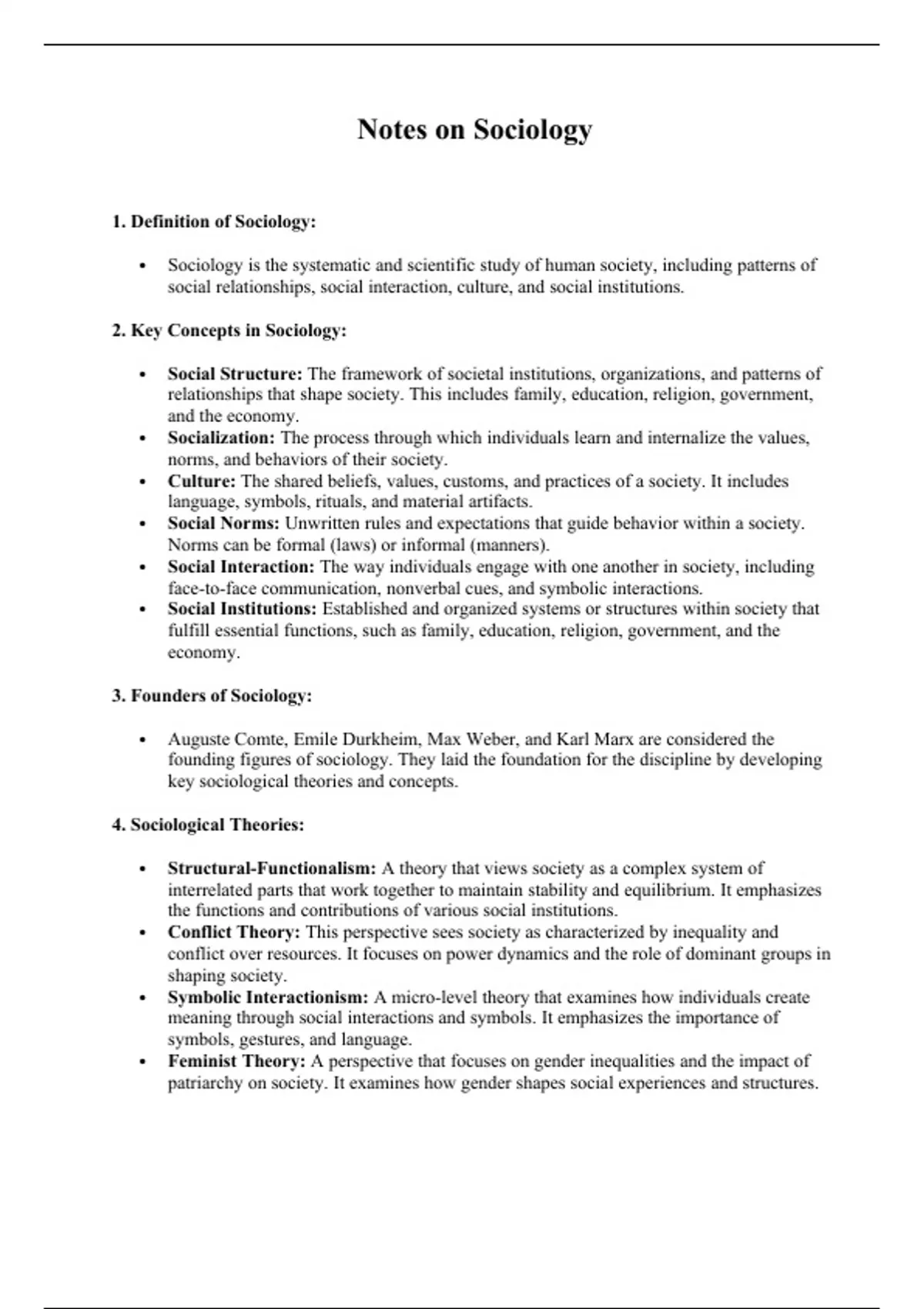 Unlock the fascinating world of sociology with our meticulously crafted study notes – your key to mastering this intriguing discipline! Whether you're a student preparing for exams or an avid learner eager to delve into the complexities of society, "Sociology Uncovered" offers a wealth of knowledge in one convenient package. What You'll Discover: Foundational Concepts: Gain a deep understanding of core sociological concepts, from social structures and norms to cultural diversity and social institutions. Key Theorists: Explore the groundbreaking work of early sociological thinkers like Comte, Durkheim, Marx, and Weber, and see how their ideas continue to shape our understanding of society. Major Theories: Dive into the major sociological theories, from structural-functionalism to conflict theory, symbolic interactionism, feminism, and critical theory. In-Depth Topics: Journey through diverse topics, including family dynamics, education systems, religion's role in society, political ideologies, global issues, and much more. Contemporary Relevance: Stay up-to-date with the latest sociological research, including the profound impact of the COVID-19 pandemic and emerging trends in the field. Why "Sociology Uncovered" Is Your Ultimate Guide: Comprehensive Coverage: We've compiled an extensive, well-structured set of notes that cover all aspects of sociology, ensuring you have the resources needed for success. Clarity and Depth: Our notes are designed to make complex sociological concepts easy to understand while providing the depth required for in-depth analysis. Study Support: Whether you're a student or lifelong learner, these notes serve as an invaluable study companion, helping you excel in your sociology courses or expand your knowledge. Unlock the secrets of society, human behavior, and the forces that shape our world with "Sociology Uncovered." Get your copy today and embark on a journey of sociological discovery! Feel free to customize this description to match the specific content and features of your notes. This description highlights the comprehensiveness, clarity, and practicality of your notes, making them an appealing resource for prospective buyers.