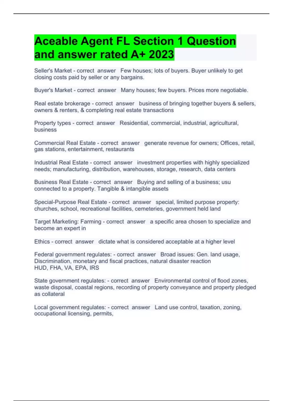 Aceable Agent FL Section 1 Question and answer rated A+ 2023