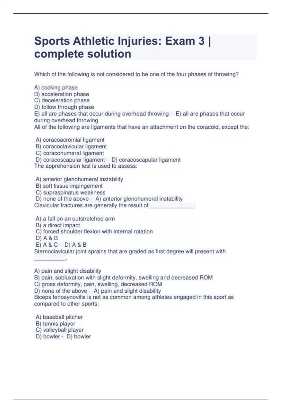Sports Athletic Injuries: Exam 3 | complete solution Which of the following is not considered to be one of the four phases of throwing? A) cocking phase B) acceleration phase C) deceleration phase D) follow through phase E) all are phases that occur during overhead throwing - E) all are phases that occur during overhead throwing All of the following are ligaments that have an attachment on the coracoid, except the: A) coracoacromial ligament B) coracoclavicular ligament C) coracohumeral ligament D) coracoscapular ligament - D) coracoscapular ligament The apprehension test is used to assess: A) anterior glenohumeral instability B) soft tissue impingement C) supraspinatus weakness D) none of the above - A) anterior glenohumeral instability Clavicular fractures are generally the result of ______________. A) a fall on an outstretched arm B) a direct impact C) forced shoulder flexion with internal rotation D) A & B E) A & C - D) A & B Sternoclavicular joint sprains that are graded as first degree will present with __________. A) pain and slight disability B) pain, subluxation with slight deformity, swelling and decreased ROM C) gross deformity, pain, swelling, decreased ROM D) none of the above - A) pain and slight disability Biceps tenosynovitis is not as common among athletes engaged in this sport as compared to other sports: A) baseball pitcher
