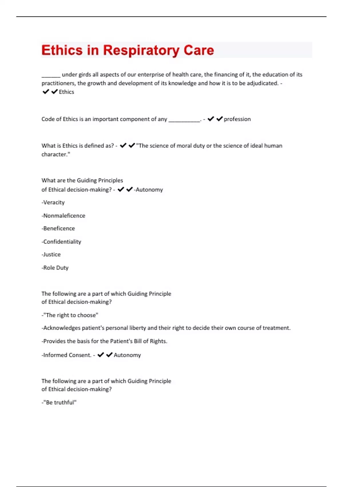 ______ under girds all aspects of our enterprise of health care, the financing of it, the education of its practitioners, the growth and development of its knowledge and how it is to be adjudicated. - Ethics Code of Ethics is an important component of any __________. - profession What is Ethics is defined as? - "The science of moral duty or the science of ideal human character." What are the Guiding Principles of Ethical decision-making? - -Autonomy -Veracity -Nonmaleficence -Beneficence -Confidentiality -Justice -Role Duty The following are a part of which Guiding Principle of Ethical decision-making? -"The right to choose" -Acknowledges patient's personal liberty and their right to decide their own course of treatment. -Provides the basis for the Patient's Bill of Rights. -Informed Consent. - Autonomy The following are a part of which Guiding Principle of Ethical decision-making? -"Be truthful"-Binds the Healthcare provider and the patient to tell the truth. -Benevolent Deception: Withholding truth from the patient for his/her good. (In cases where truth can lead to harm for the patient) - Veracity The following are a part of which Guiding Principle of Ethical decision-making? -Obligates the healthcare provider to avoid harming the patient. -Actively prevent harm where possible. (ex. Being cognizant of potential adverse effects of therapeutic drugs) -Double Effect (If the first intent is good then the harmful effect is viewed as unintended) - Nonmaleficence What is "Double Effect"? -If the first intent is good then the harmful effect is viewed as unintended. The following are a part of which Guiding Principle of Ethical decision-making? -Requires the healthcare provider to go beyond doing no harm and actively contribute to the well-being of their patients. -Implies that the healthcare provider must do everything to promote a patient's life. -Advanced Directives- Allow the patient to determine the extent of care. - Beneficence The following are a part of which Guiding Principle of Ethical decision-making? -"Respect the Secrets" -HIPAA- Health Insurance Portability and Accountability Act -Patient information should be discussed only in private and with persons who have a legitimate reason and need to know -Harm Principle- requires that confidentiality be broken when the welfare of the community is at risk -There is a legal requirement to such things as: child abuse, poisonings, industrial accidents, communicable diseases, blood transfusion reactions, narcotic use, and injuries caused by knives or guns - Confidentiality