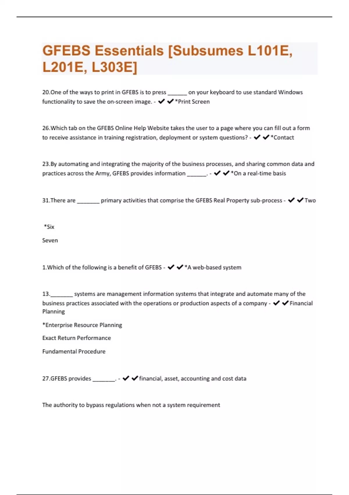 20.One of the ways to print in GFEBS is to press ______ on your keyboard to use standard Windows functionality to save the on-screen image. - *Print Screen 26.Which tab on the GFEBS Online Help Website takes the user to a page where you can fill out a form to receive assistance in training registration, deployment or system questions? - *Contact 23.By automating and integrating the majority of the business processes, and sharing common data and practices across the Army, GFEBS provides information ______. - *On a real-time basis 31.There are _______ primary activities that comprise the GFEBS Real Property sub-process - Two *Six Seven 1.Which of the following is a benefit of GFEBS - *A web-based system 13._______ systems are management information systems that integrate and automate many of the business practices associated with the operations or production aspects of a company - Financial Planning *Enterprise Resource Planning Exact Return Performance Fundamental Procedure 27.GFEBS provides _______. - financial, asset, accounting and cost data The authority to bypass regulations when not a system requirementAutomated Army, Air force, and Navy financial reports integration 7.GFEBS uses the ERP program SAP, which provides _______. - A common data structure Automated accounting transaction corrections 28.What areas are included in Property, Plant, and Equipment (PP&E)? - *All of the above 16.GFEBS strategically supports and improves the current Department of Defense (DoD) Business Enterprise Architecture by providing functionality that supports various business components which include all of the following except: - Acquisitions Installations and Environment *Strategic planning and budgeting 14.Which of the following activities fall within the Reimbursables business process area? - *All of the above 35.What is a type of Real Property? - *Office Buildings Plant Equipment None of the above 37.The ____ is used to set standard default information for specific fields when the user is setup in GFEBS. This information is used to identify specific functions or activities related to the user. - *Paramters tab
