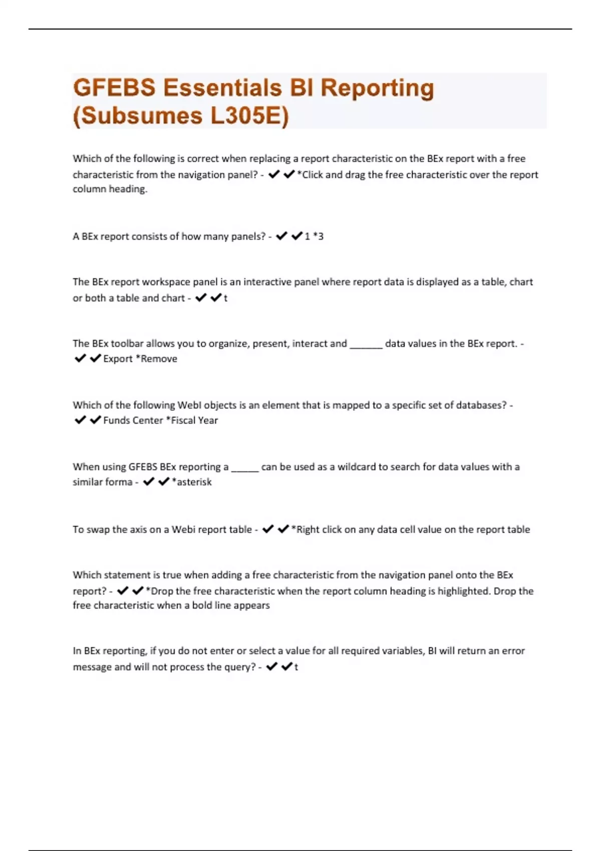 Which of the following is correct when replacing a report characteristic on the BEx report with a free characteristic from the navigation panel? - *Click and drag the free characteristic over the report column heading. A BEx report consists of how many panels? - 1 *3 The BEx report workspace panel is an interactive panel where report data is displayed as a table, chart or both a table and chart - t The BEx toolbar allows you to organize, present, interact and ______ data values in the BEx report. - Export *Remove Which of the following WebI objects is an element that is mapped to a specific set of databases? - Funds Center *Fiscal Year When using GFEBS BEx reporting a _____ can be used as a wildcard to search for data values with a similar forma - *asterisk To swap the axis on a Webi report table - *Right click on any data cell value on the report table Which statement is true when adding a free characteristic from the navigation panel onto the BEx report? - *Drop the free characteristic when the report column heading is highlighted. Drop the free characteristic when a bold line appears In BEx reporting, if you do not enter or select a value for all required variables, BI will return an error message and will not process the query? - tWhen using GFEBS BEx reporting, the following procedures must be followed when using multiple variable data values - all of the above The favorites folder is a personal area where user-defined reports and folders can be all except the following by the user - shared *accessed