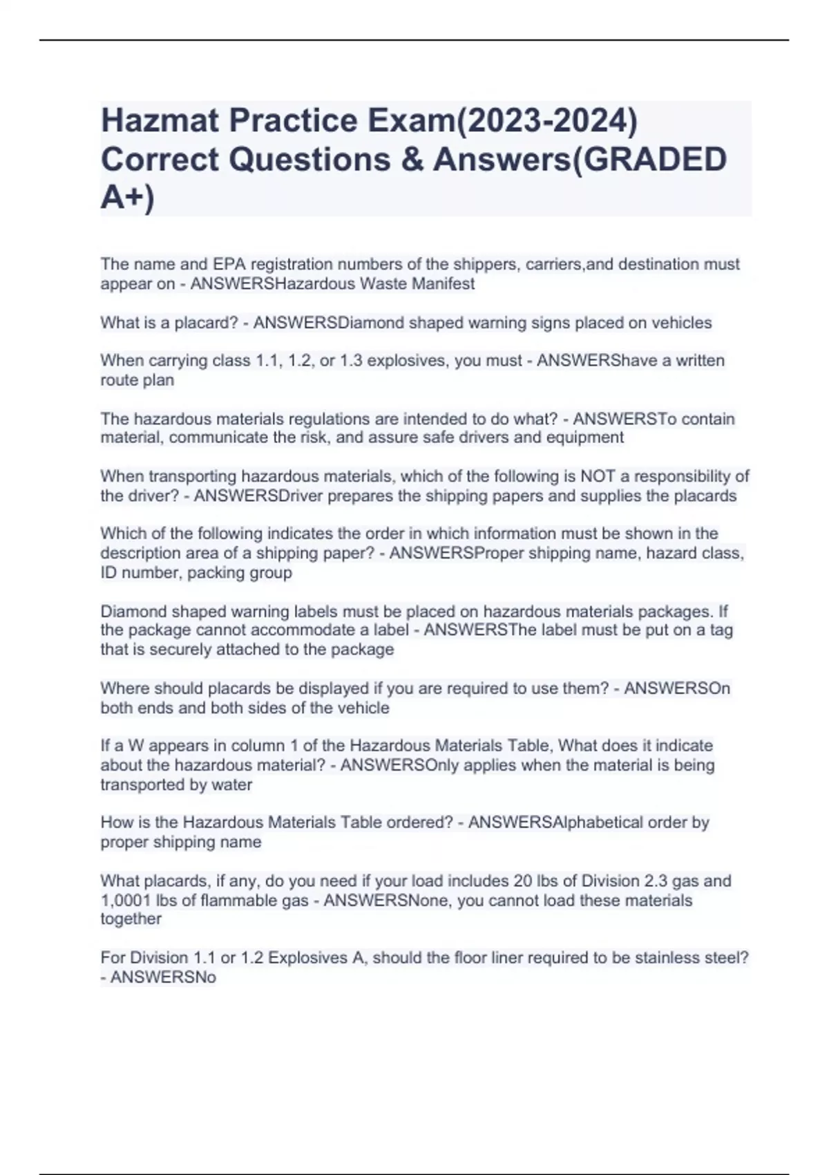 Hazmat Practice Exam() Correct Questions & Answers(GRADED A+)