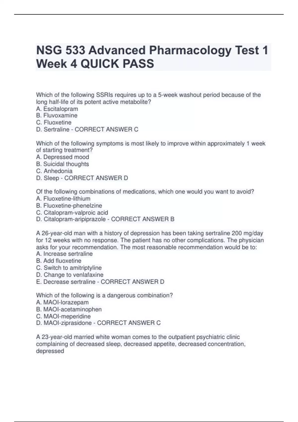 NSG 533 Advanced Pharmacology Test 1 Week 4 QUICK PASS Which of the following SSRIs requires up to a 5-week washout period because of the long half-life of its potent active metabolite? A. Escitalopram B. Fluvoxamine C. Fluoxetine D. Sertraline - CORRECT ANSWER C Which of the following symptoms is most likely to improve within approximately 1 week of starting treatment? A. Depressed mood B. Suicidal thoughts C. Anhedonia D. Sleep - CORRECT ANSWER D Of the following combinations of medications, which one would you want to avoid? A. Fluoxetine-lithium B. Fluoxetine-phenelzine C. Citalopram-valproic acid D. Citalopram-aripiprazole - CORRECT ANSWER B A 26-year-old man with a history of depression has been taking sertraline 200 mg/day for 12 weeks with no response. The patient has no other complications. The physician asks for your recommendation. The most reasonable recommendation would be to: A. Increase sertraline B. Add fluoxetine C. Switch to amitriptyline D. Change to venlafaxine E. Decrease sertraline - CORRECT ANSWER D Which of the following is a dangerous combination? A. MAOI-lorazepam B. MAOI-acetaminophen C. MAOI-meperidine D. MAOI-ziprasidone - CORRECT ANSWER C A 23-year-old married white woman comes to the outpatient psychiatric clinic complaining of decreased sleep, decreased appetite, decreased concentration, depressed mood, thoughts of death, and lack of interest in activities for 6 weeks' duration. She has no history of psychiatric illness and takes no medications except for Ortho-Tri Cyclen Lo daily. Based upon the patients symptoms, choose the best medication to treat this patient. A. Nefazodone 100 mg po twice daily B. Paroxetine 20 mg po daily C. St. John's wort 300 mg po three times daily D. Amitriptyline 25 mg at bedtime - CORRECT ANSWER B A 36-year-old man is admitted to the hospital for a severe methicillin-resistant Staphylococcus aureus diabetic foot infection and is started on linezolid 600 mg IV every 12 hours. His medication profile includes paroxetine 40 mg every morning, trazodone 100 mg at bedtime as needed for sleep, and metformin 1000 mg po twice daily. After 3 days on these medications, the patient becomes agitated, confused, and diaphoretic and develops myoclonic jerks. Which of the following is the most likely diagnosis? A. Overdose of metformin B. Bacterial meningitis C. Neuroleptic malignant syndrome D. Serotonin syndrome - CORRECT ANSWER D A 46-year-old woman presents to the psychiatric outpatient clinic for follow-up treatment of major depression. She is currently on paroxetine 10 mg at bedtime, which she started taking 2 months ago when admitted to the psychiatric hospital for suicidal ideation. During the interview, she says that she does not think the medication is working because she is just as depressed as she was before taking the medication and has recently started drinking eight to 10 beers daily to alleviate the depression. Before this episode, she was sober for 4 years. Which of the following treatment strategies would be the appropriate choice for this patient? A. Stop the paroxetine and start nefazodone 100 mg po twice daily B. Increase the dose of paroxetine to 20 mg po at bedtime C. Stop the paroxetine and start duloxetine 20 mg/day D. Continue the paroxetine at them same dose for a longer period of time to evaluate whether she will respond or not - CORRECT ANSWER B Which of the following is a flaw in the monoamine hypothesis of depression? A. Concentrations of neurotransmitters are reduced in the synaptic cleft B. A switch to a different class of antidepressants does not improve response C. Antidepressant response is associated with a therapeutic level of the medication D. Antidepressant effects on neurotransmitters do not temporally correspond to response. - CORRECT ANSWER D A 26-year-old patient with a first episode of depression has been treated with duloxetine 60 mg twice daily for the past 4 months. The patient would like to discontinue treatment. The patient should be told that they need at least _____full months of antidepressant therapy after reaching full remission. A. 3 B. 6 C. 9 D. 12 - CORRECT ANSWER B