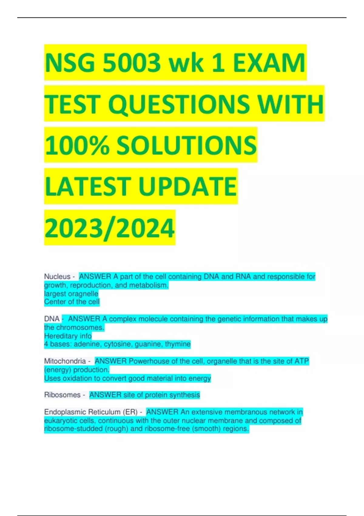 NSG 5003 wk 1 EXAM TEST QUESTIONS WITH 100% SOLUTIONS LATEST UPDATE 2023/2024 Nucleus - ANSWER A part of the cell containing DNA and RNA and responsible for growth, reproduction, and metabolism. largest oragnelle Center of the cell DNA - ANSWER A complex molecule containing the genetic information that makes up the chromosomes. Hereditary info 4 bases: adenine, cytosine, guanine, thymine Mitochondria - ANSWER Powerhouse of the cell, organelle that is the site of ATP (energy) production. Uses oxidation to convert good material into energy Ribosomes - ANSWER site of protein synthesis Endoplasmic Reticulum (ER) - ANSWER An extensive membranous network in eukaryotic cells, continuous with the outer nuclear membrane and composed of ribosome-studded (rough) and ribosome-free (smooth) regions. Rough ER - ANSWER covered with ribosomes that make membrane proteins and secretory proteins. Smooth ER - ANSWER No ribosomes, makes lipids and detox secretory vesicles - ANSWER protein hormones and enzymes stored, awaiting signals to be released. lysosome - ANSWER contains digestive enzymes Cytoskeleton - ANSWER helps the cell maintain its shape and is involved in many forms of cell movement. network of microtubules, microfilaments, intermediate filaments. Golgi apparatus - ANSWER modifies, sorts, and packages proteins Osmolality - ANSWER the concentration of solutes in body fluids IF HIGH= DEHYDRATION Osmolarity - ANSWER total concentration of all solute particles in a solution Glycolysis - ANSWER the breakdown of glucose by enzymes, releasing energy and pyruvic acid. FORMS 2 ATP+ 2 PYRUVATE Phagocytosis - ANSWER A type of endocytosis in which a cell engulfs large particles or whole cells. CELL EATING Pinocytosis - ANSWER A type of endocytosis in which the cell ingests extracellular fluid and its dissolved solutes. CELL DRINKING Endocytosis - ANSWER bringing substances into the cell through a vesicle or phagosome Diffusion - ANSWER Movement of molecules from an area of higher concentration to an area of lower concentration. facilitated diffusion - ANSWER process of diffusion. USES A CARRIER MOLECULE simple diffusion - ANSWER Diffusion that doesn't involve a direct input of energy or assistance by carrier proteins. Osmosis - ANSWER diffusion of water Excocytosis - ANSWER movement of large amounts of material out of the cell. neurotransmitters are packaged into vesicles and fuse with the cell membrane for release. active transport - ANSWER Energy-requiring process (VIA CARRIER PROTEIN) that moves material across a cell membrane against a concentration difference passive transport - ANSWER Requires NO energy, Movement of molecules from high to low concentration, Moves with the concentration gradient action potential - ANSWER neuronal repolarization due to efflux of potassium. energy production - ANSWER ATP. The breakdown of glucose (carbs) and triglycerides (fats) Mictochondria - ANSWER produces ATP through aerobic respiration Chromosomes - ANSWER threadlike structures made of DNA molecules that contain the genes DNA - ANSWER A complex molecule containing the genetic information that makes up the chromosomes. Nucleotide - ANSWER Genetic codes are stored. A building block of DNA, consisting of a five-carbon sugar covalently bonded to a nitrogenous base and a phosphate group. Nitrogen bases - ANSWER A-T and C-G match. Purine: adenine & guanine Pyrimidine: thymine & cytosine osmotic pressure - ANSWER the external pressure that must be applied to stop osmosis base pairs - ANSWER A-T G-C Genes - ANSWER DNA segments that serve as the key functional units in hereditary transmission. Template of protein synthesis. Genotype - ANSWER genetic makeup Phenotype - ANSWER physical characteristics of an organism (blue eyes) Genome - ANSWER the complete set of DNA and genes Replication - ANSWER process of copying DNA prior to cell division Differentiation - ANSWER process in which cells become specialized in structure and function cell cycle - ANSWER series of events in which a cell grows, prepares for division, and divides to form two daughter cells Interphase - ANSWER consists of G1, S, and G2 phases. Checkpoint where damaged DNA is fixed Mitosis - ANSWER cell division in MATURE somatic cells (nongamete) Meiosis - ANSWER Cell division that produces reproductive cells (sperm & ova) Cellular Organization - ANSWER All living things are composed of one or more cells epithelial tissue - ANSWER protection, absorption, filtration, secretion connective tissue functions - ANSWER binds body tissues together, supports the body, provides protection. made up of a large extracellular matrix and fibroblast cells Three types of Fibers (FIBROBLAST CELLS): collagen elastic reticular Neural tissue function - ANSWER carries electrical signals from one part of the body to another. composed of neurons. Axon: conducts impulse away body Dendrites: conduct impulse toward body muscle tissue - ANSWER contracts or shortens, making body parts move. made of fibers (myocytes) that consists of actin and myosin. Muscle fibers: smooth cardiac skeletal voluntary (skeletal movement) involuntary (heart) cellular damage - ANSWER Injury on the cellular level resulting from sufficient exposure to ionizing radiation at the molecular level. Cellular Adaptation - ANSWER atrophy, hypertrophy, hyperplasia, metaplasia, dysplasia inflammation - ANSWER a localized response to an injury or to the destruction of tissues atrophy - ANSWER to waste away hypertrophy - ANSWER increase in size Hyperplasia - ANSWER increase in number of cells Metaplasia - ANSWER Mature cell type is replaced by a different mature cell type Dysplasia (atypical hyperplasia) - ANSWER abnormal development or growth of cells, tissues, or organs Apoptosis - ANSWER programmed cell death Inappropriate (too much or not enough) leads to denereative neurological disease ( ischemia, Alz's, autimmune disorders) necrosis - ANSWER death of tissue Liquefaction necrosis - ANSWER Dead cells liquefy due to release