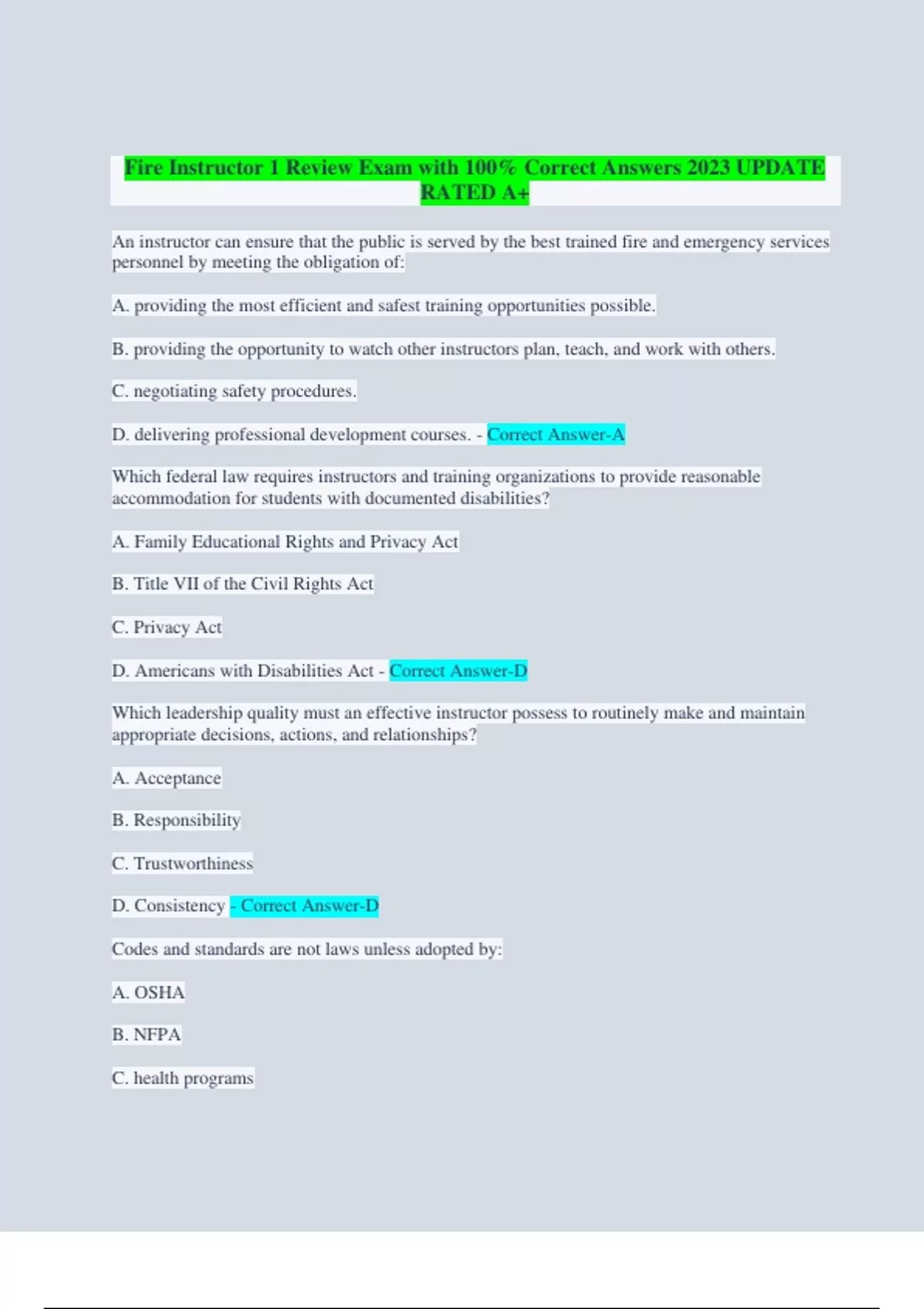 An instructor can ensure that the public is served by the best trained fire and emergency services personnel by meeting the obligation of: A. providing the most efficient and safest training opportunities possible. B. providing the opportunity to watch other instructors plan, teach, and work with others. C. negotiating safety procedures. D. delivering professional development courses. - Correct Answer-A Which federal law requires instructors and training organizations to provide reasonable accommodation for students with documented disabilities? A. Family Educational Rights and Privacy Act B. Title VII of the Civil Rights Act C. Privacy Act D. Americans with Disabilities Act - Correct Answer-D Which leadership quality must an effective instructor possess to routinely make and maintain appropriate decisions, actions, and relationships? A. Acceptance B. Responsibility C. Trustworthiness D. Consistency - Correct Answer-D